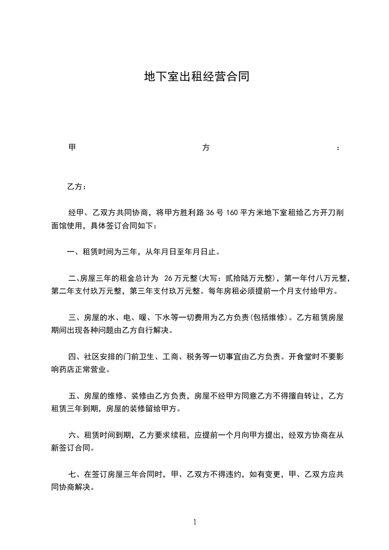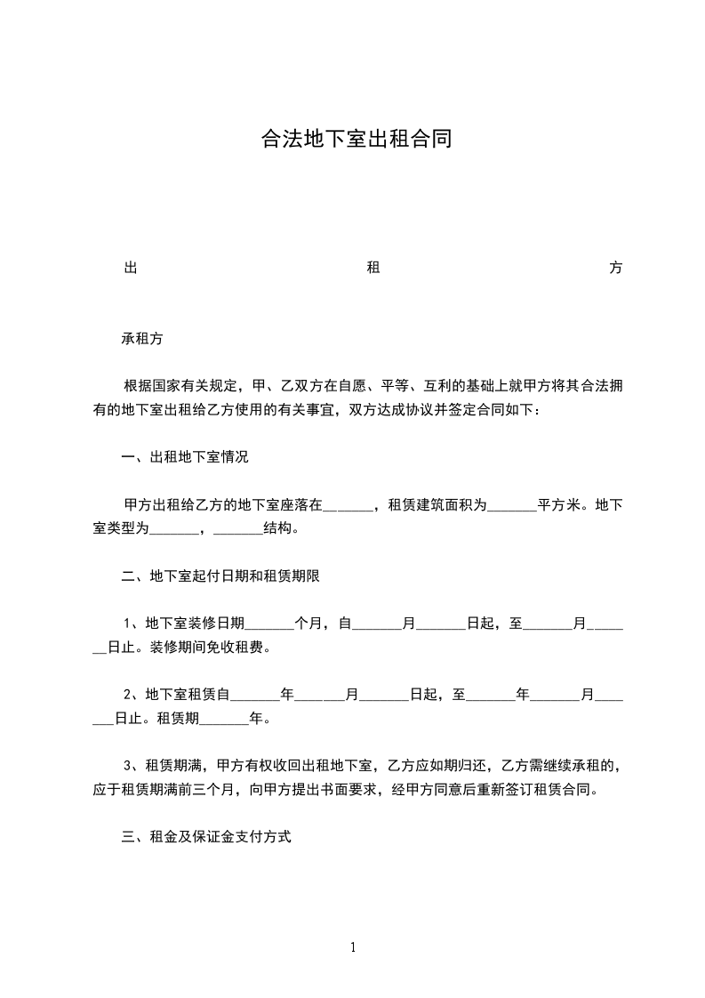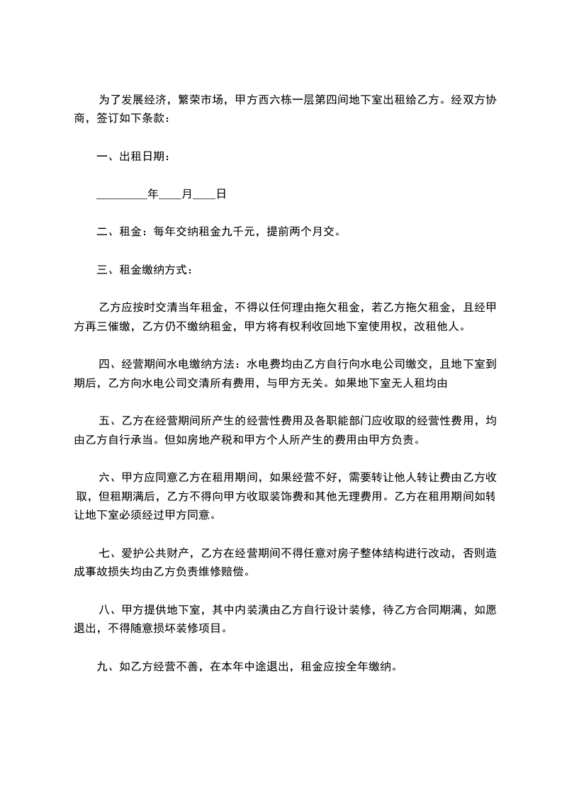 三、安全:乙方在地下室租住期间,由自身引起的一切安全事故,由乙方自负全部责任。