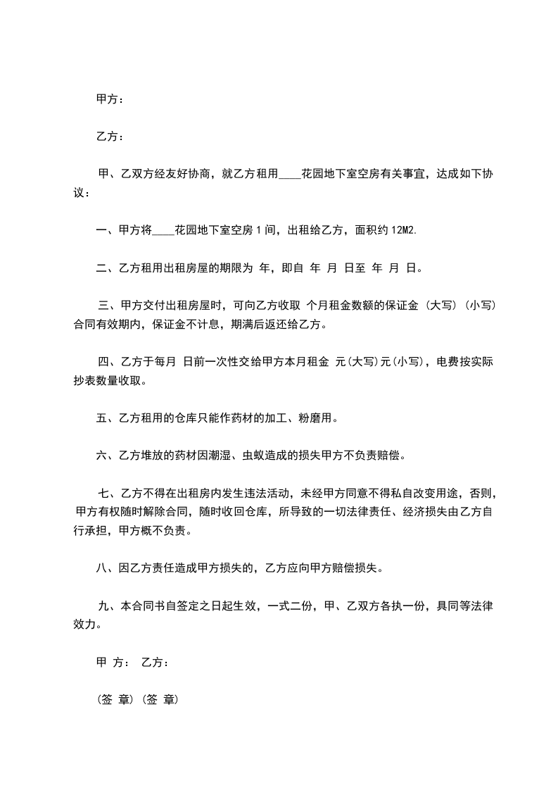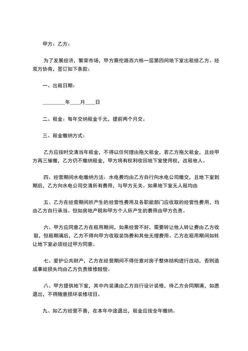 十、乙方遵守地下室内各项规章制度,如乙方不遵守制度,甲方有权清除地下室各种费用不退。