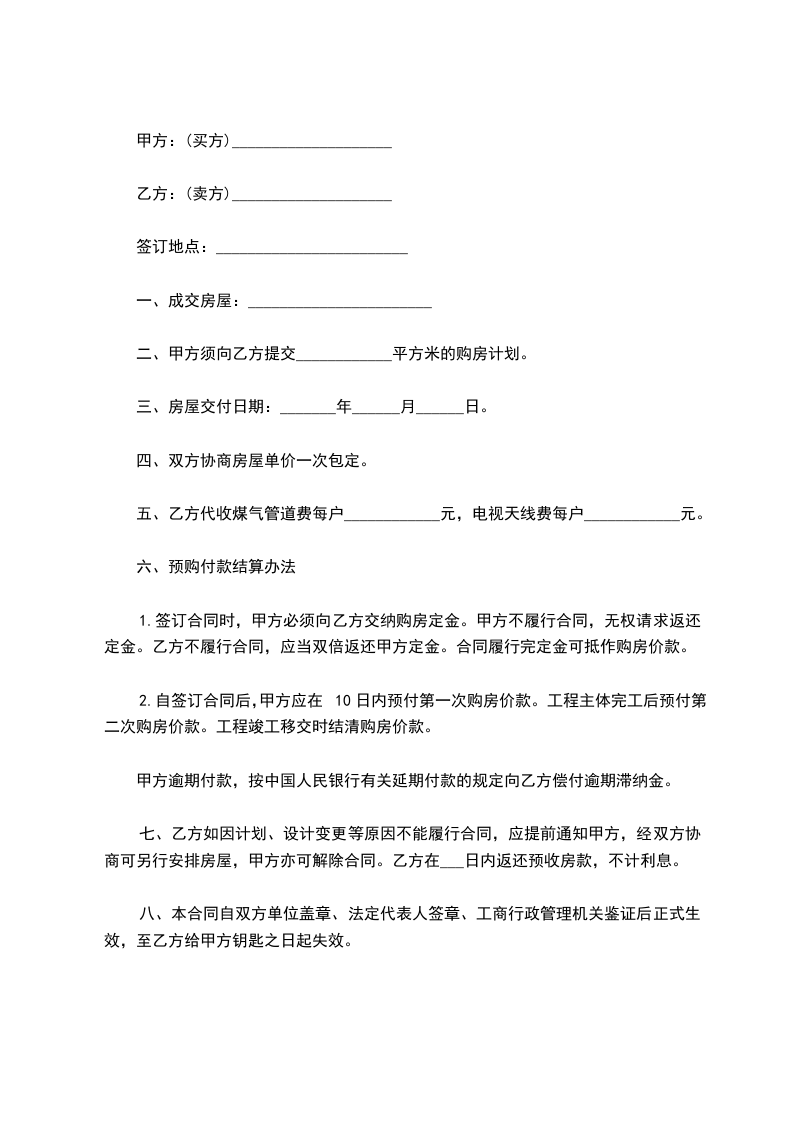 1.签订合同时,甲方必须向乙方交纳购房定金。甲方不履行合同,无权请求返还定金。乙方不履行合同,应当双倍返还甲方定金。合同履行完定金可抵作购房价款。