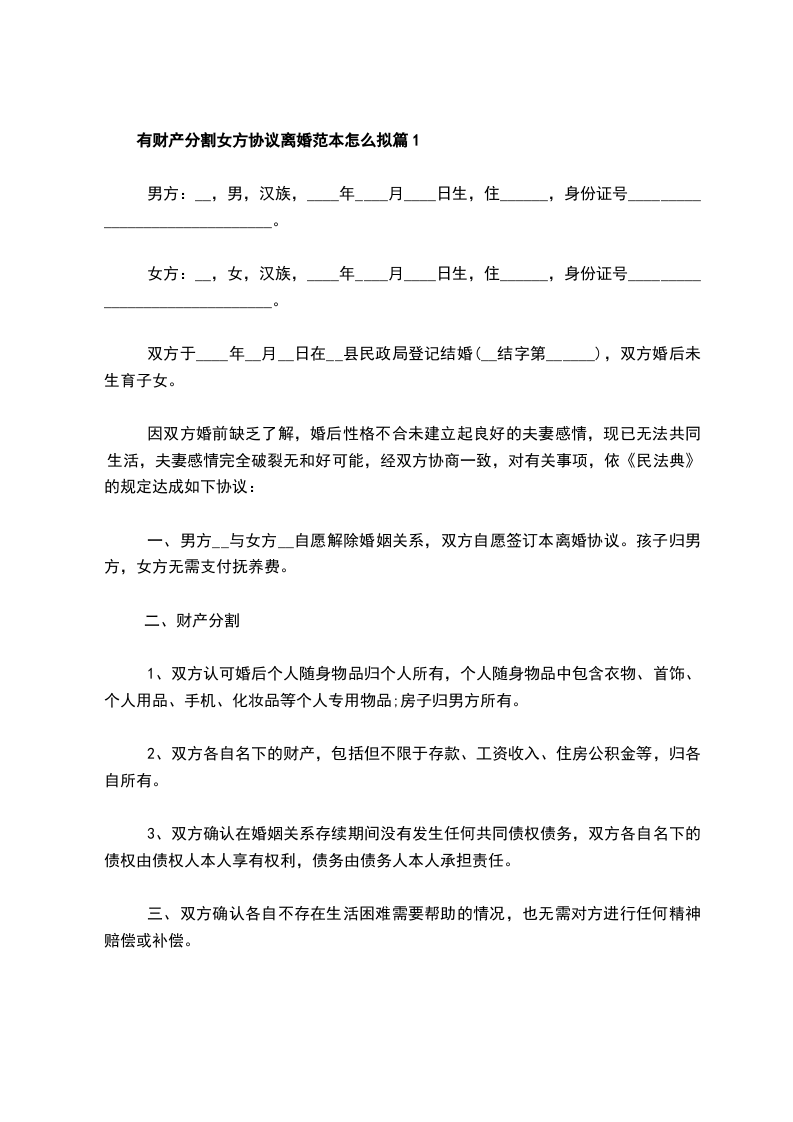 有财产分割女方协议离婚范本怎么拟篇2