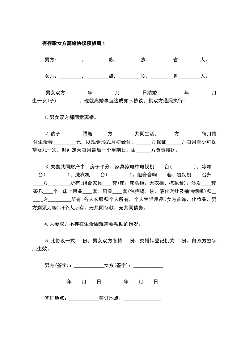 有存款女方离婚协议模板篇5