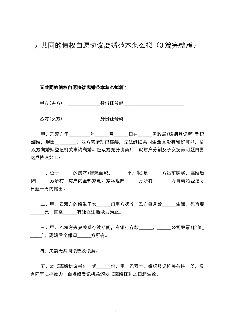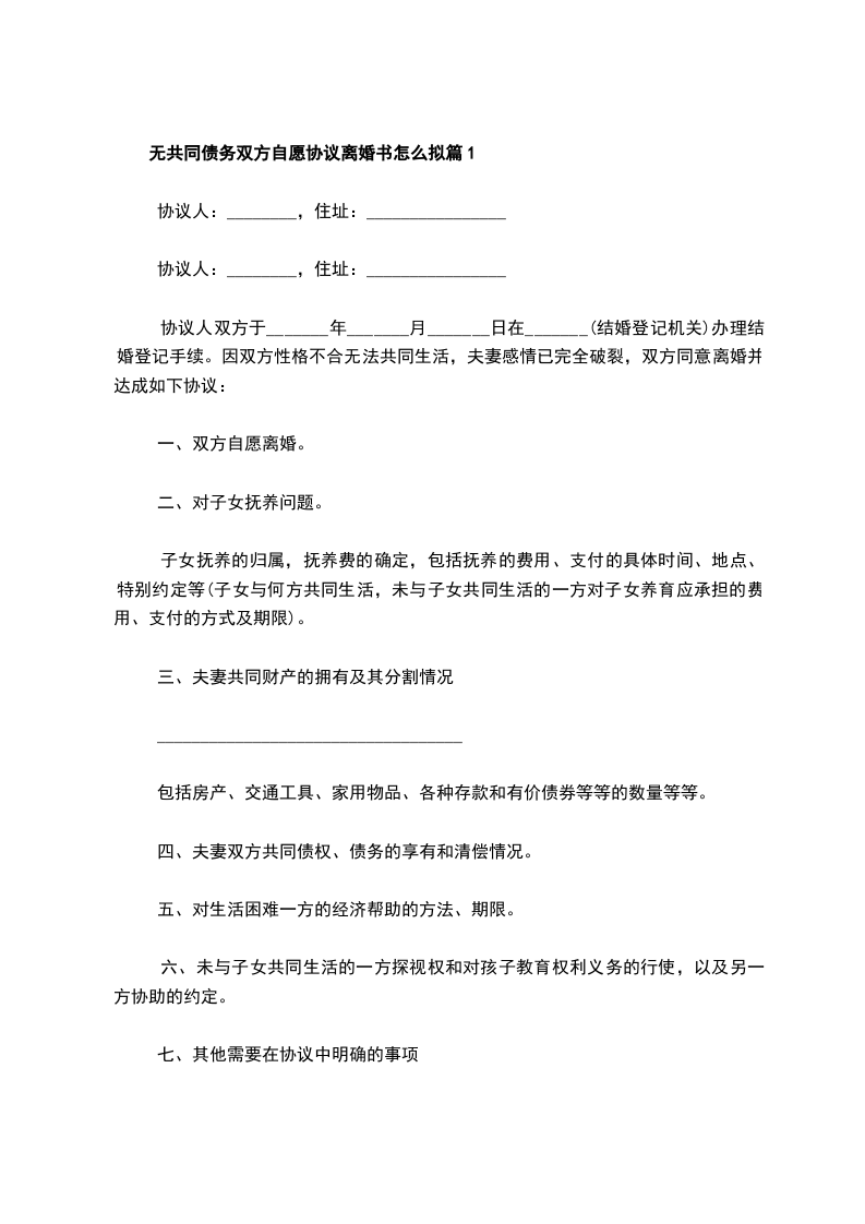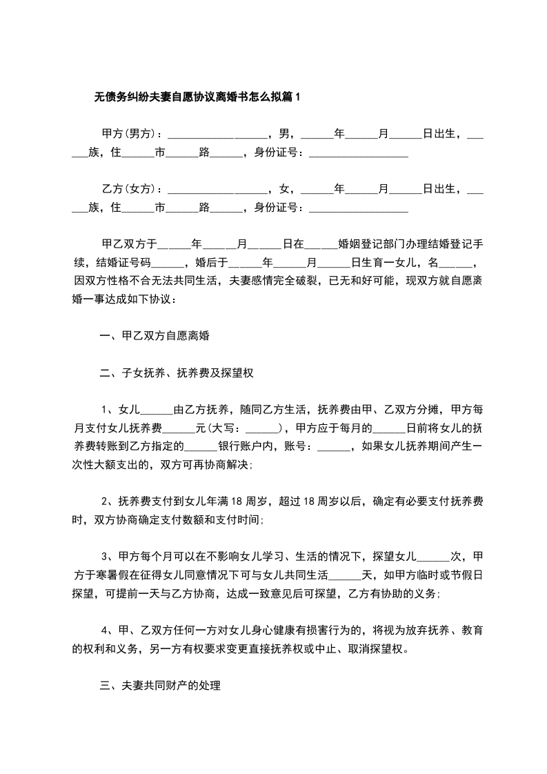 无债权自愿离婚协议书怎么拟篇3