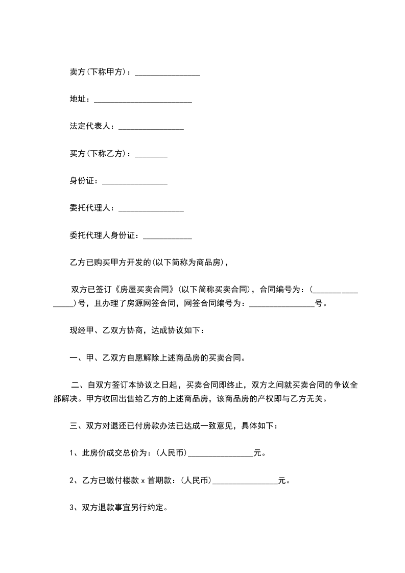 二、自双方签订本协议之日起,买卖合同即终止,双方之间就买卖合同的争议全部解决。甲方收回出售给乙方的上述商品房,该商品房的产权即与乙方无关。