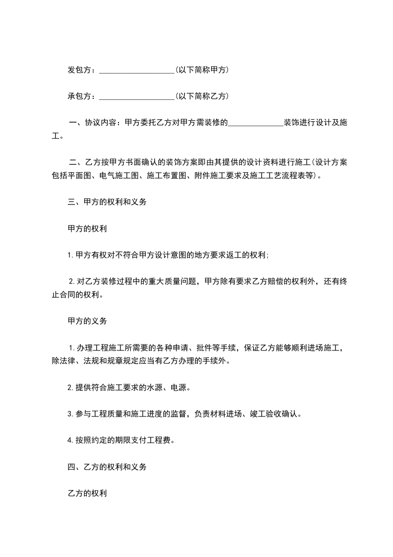 一、协议内容:甲方委托乙方对甲方需装修的______________装饰进行设计及施工。