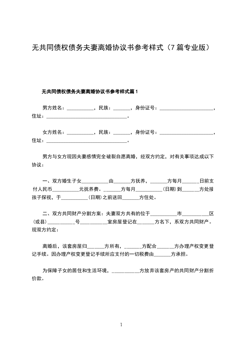 乙方:(男方):_______________,男,汉族,生于_____年__月__日,住________________________________