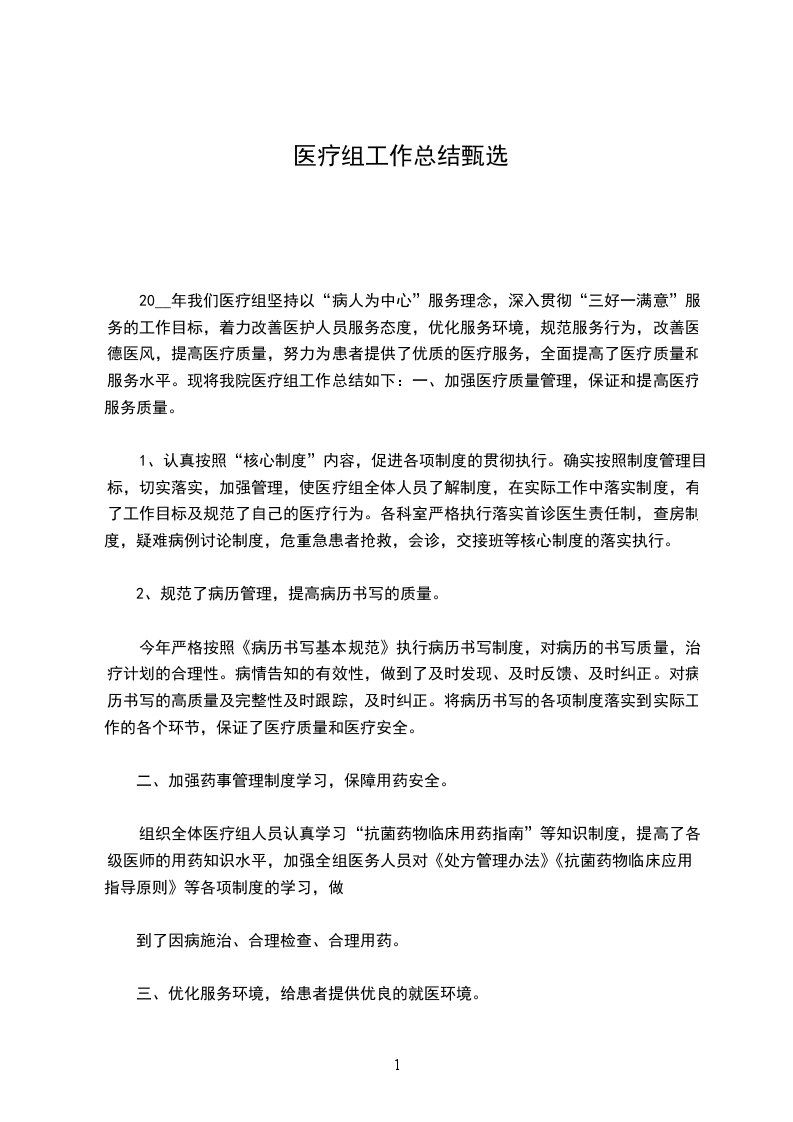 20__年我们医疗组坚持以“病人为中心”服务理念,深入贯彻“三好一满意”服务的工作目标,着力改善医护人员服务态度,优化服务环境,规范服务行为,改善医德医风,提高医疗质量,努力为患者提供了优质的医疗服务,全面提高了医疗质量和服务水平。现将我院医疗组工作总结如下:一、加强医疗质量管理,保证和提高医疗服务质量。