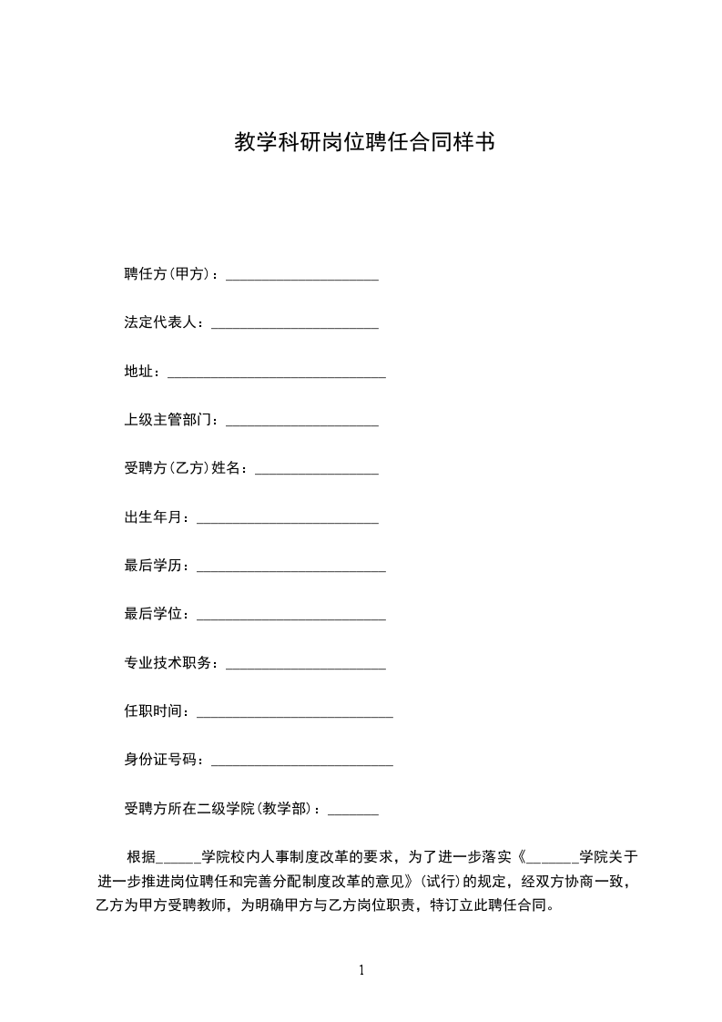 根据______学院校内人事制度改革的要求,为了进一步落实《_______学院关于进一步推进岗位聘任和完善分配制度改革的意见》(试行)的规定,经双方协商一致,乙方为甲方受聘教师,为明确甲方与乙方岗位职责,特订立此聘任合同。