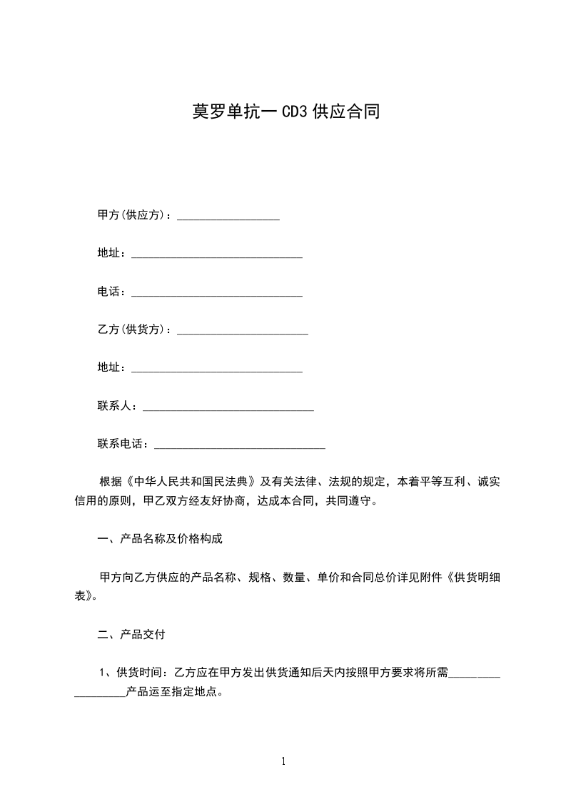 根据《中华人民共和国民法典》,甲、乙双方经协商确定,甲方向乙方购买药品。为明确双方责任和权利,特签订本合同,共同遵守。具体条款如下: