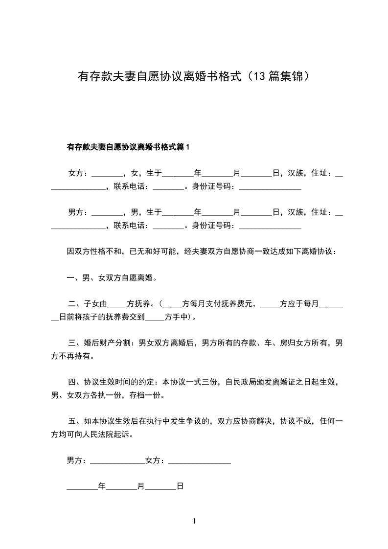 1、存款:双方名下现有银行存款共______元,双方各分一半,为______元。分配方式:各自名下的存款保持不变,但男方/女方应于_____年____月____日前一次性支付_____元给女方/男方。