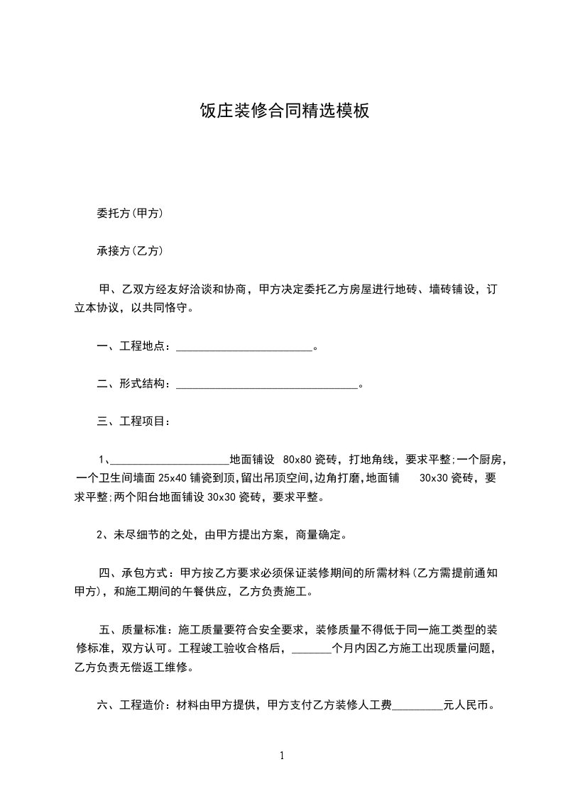 六、工程造价:材料由甲方提供,甲方支付乙方装修人工费_________元人民币。