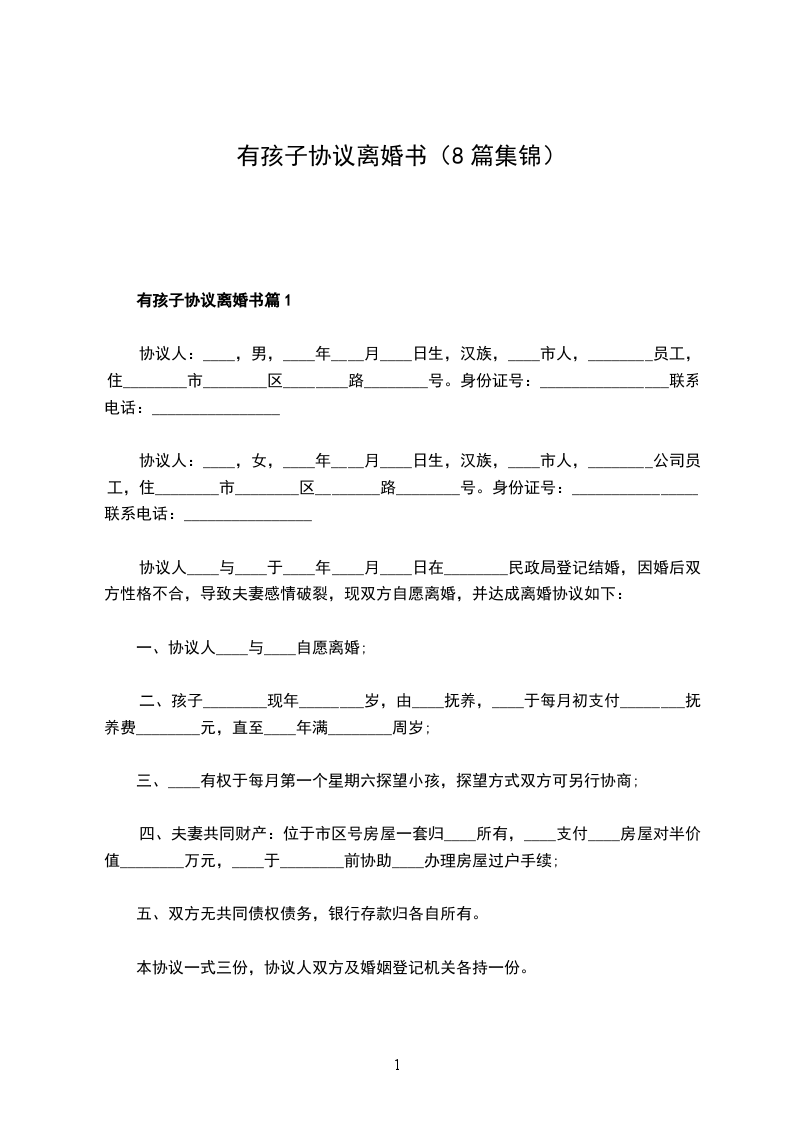 九、本协议一式________份,自婚姻登记处颁发离婚证之日起生效,男、女双方各执________份,婚姻登记机关存档一份。