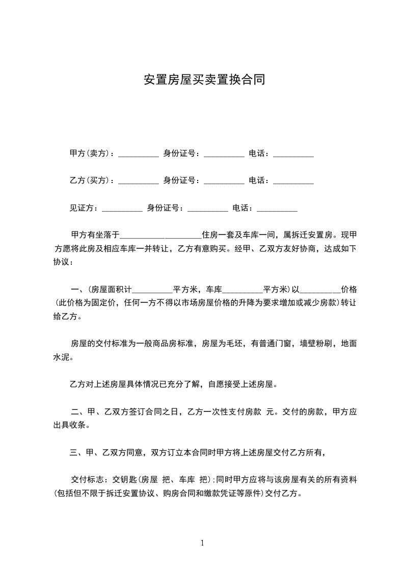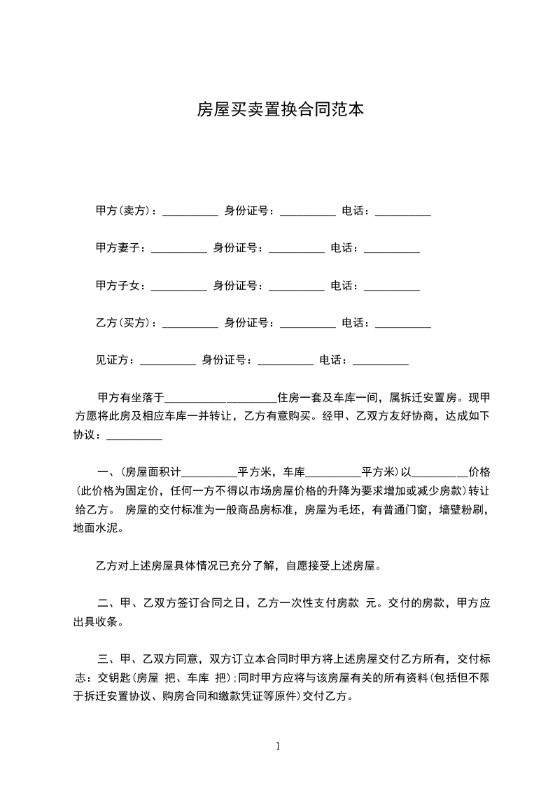 一、(房屋面积计__________平方米,车库__________平方米)以__________价格(此价格为固定价,任何一方不得以市场房屋价格的升降为要求增加或减少房款)转让给乙方。 房屋的交付标准为一般商品房标准,房屋为毛坯,有普通门窗,墙壁粉刷,地面水泥。