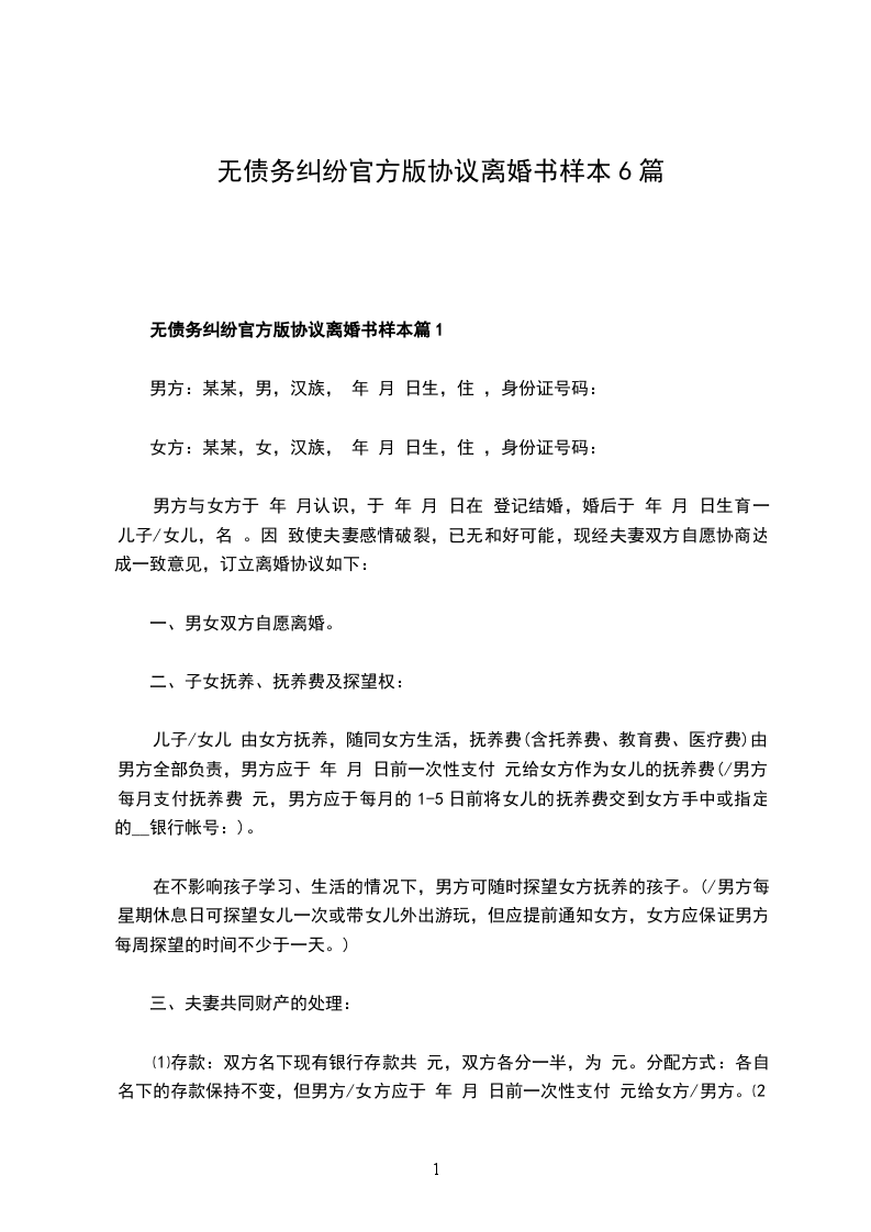 协议人双方于_______年_______月_______日登记结婚,_______年_______月_______日生育一子,取名_______。现协议双方夫妻感情确已完全破裂,经双方协商一致,自愿离婚、财产分割及子女抚养事宜达成如下协议: