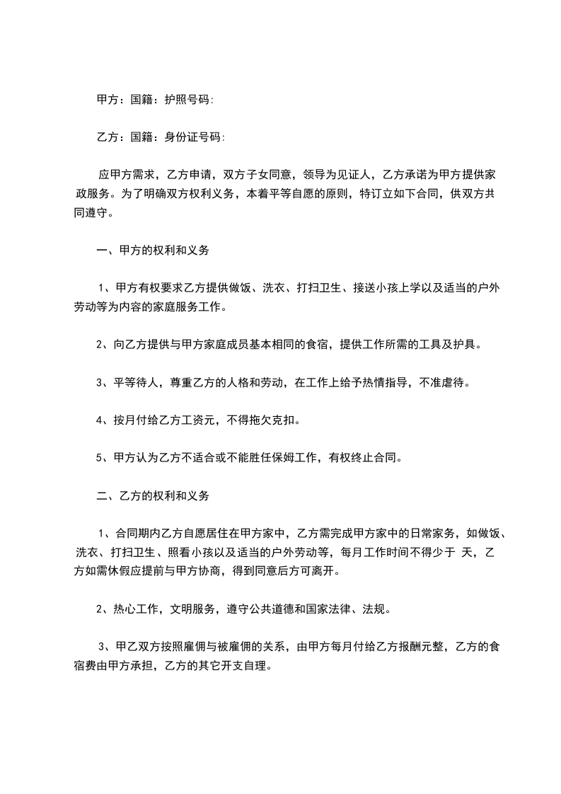 根据《中华人民共和国民法典》等有关法律、法规的规定,甲乙双方本着平等、自愿的原则就乙方为甲方提供保姆服务有关事宜,达成如下协议: