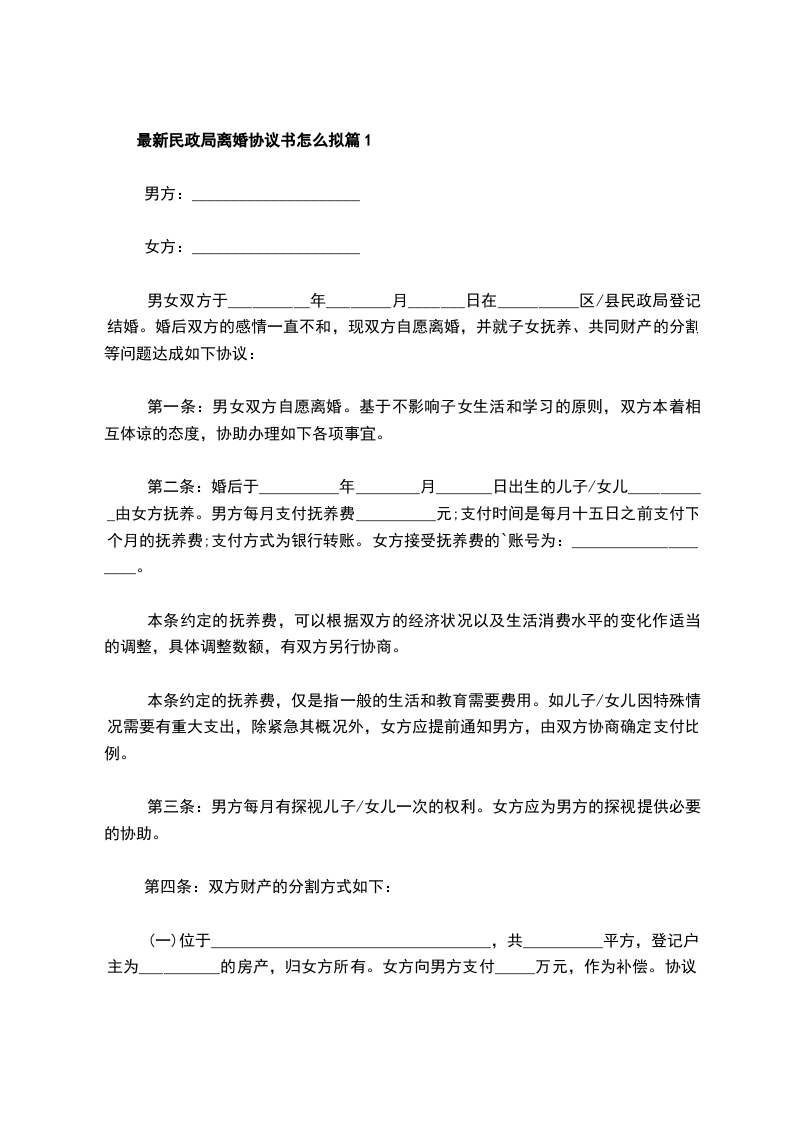 第一条:男女双方自愿离婚。基于不影响子女生活和学习的原则,双方本着相互体谅的态度,协助办理如下各项事宜。