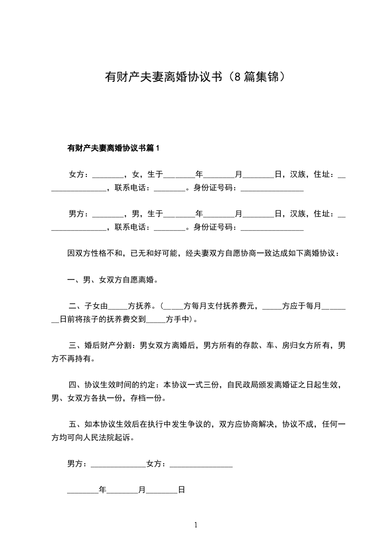 乙方:(男方):_______________,男,汉族,生于_____年__月__日,住________________________________