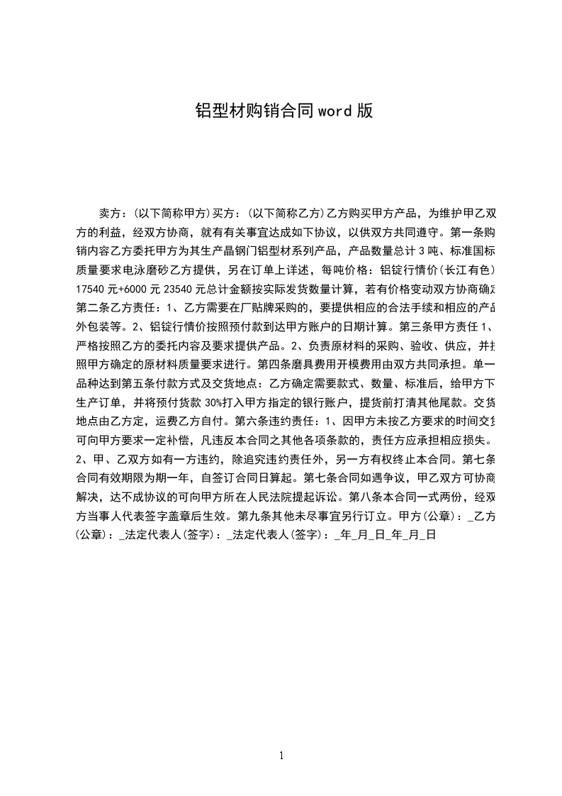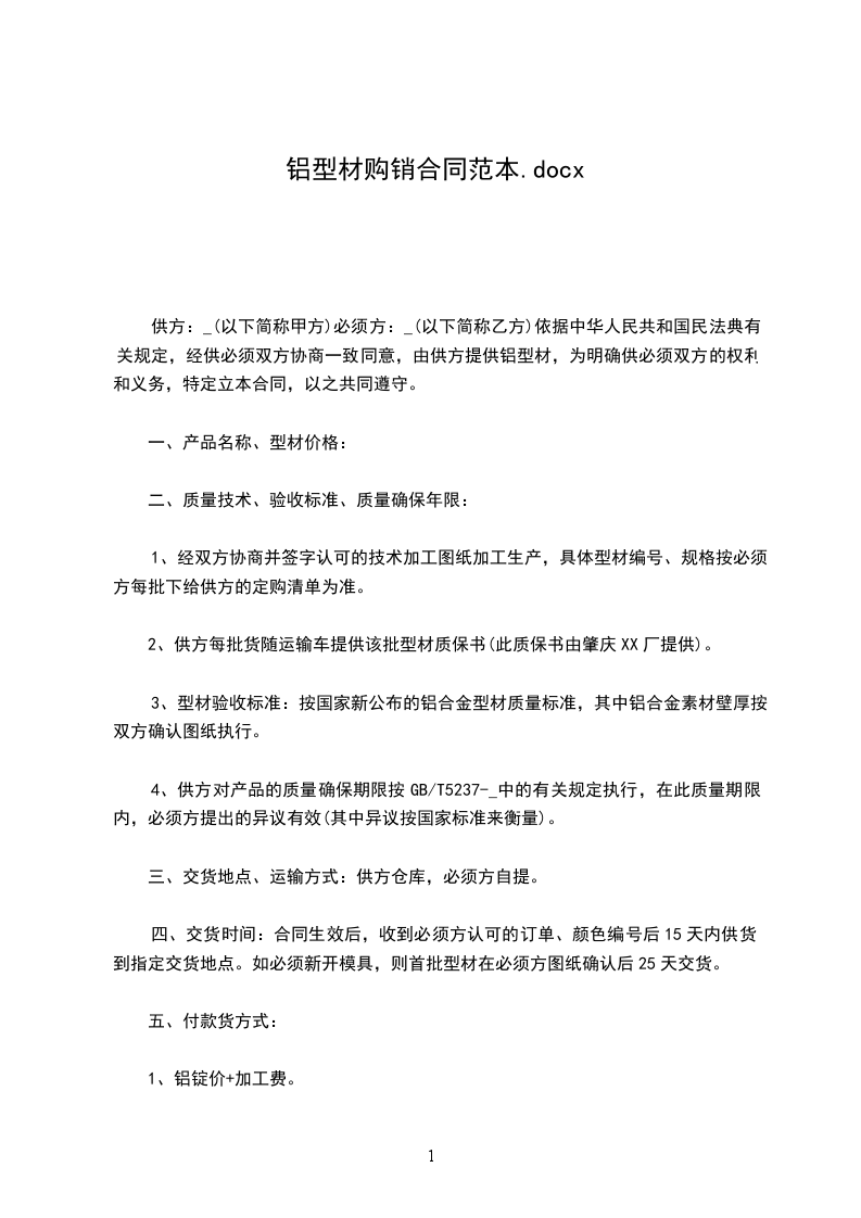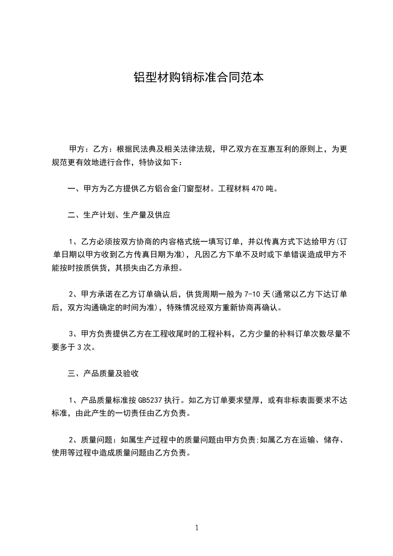 依据《中华人民共和国民法典》有关规定,经供需双方协商一致同意,由供方提供铝型材,为明确供需双方的权利和义务,特定立本合同,以之共同遵守。