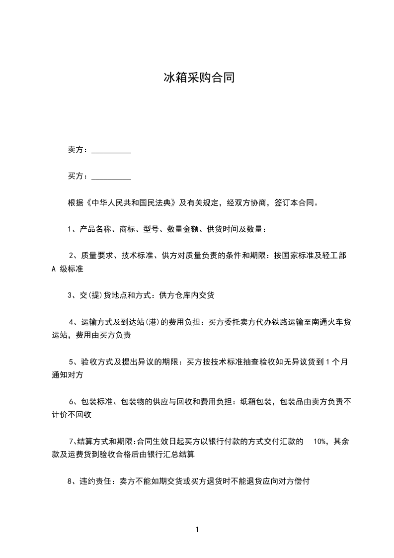 8、违约责任:卖方不能如期交货或买方退货时不能退货应向对方偿付