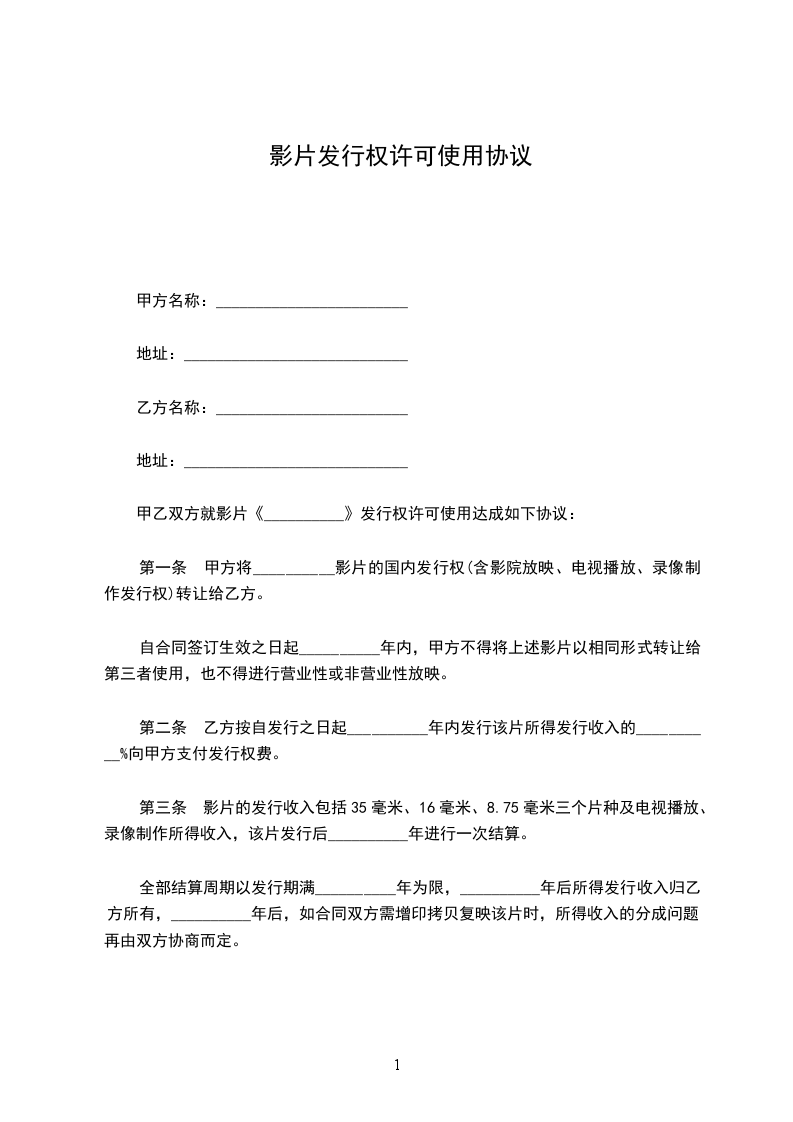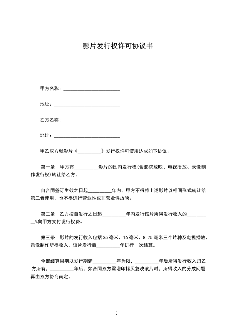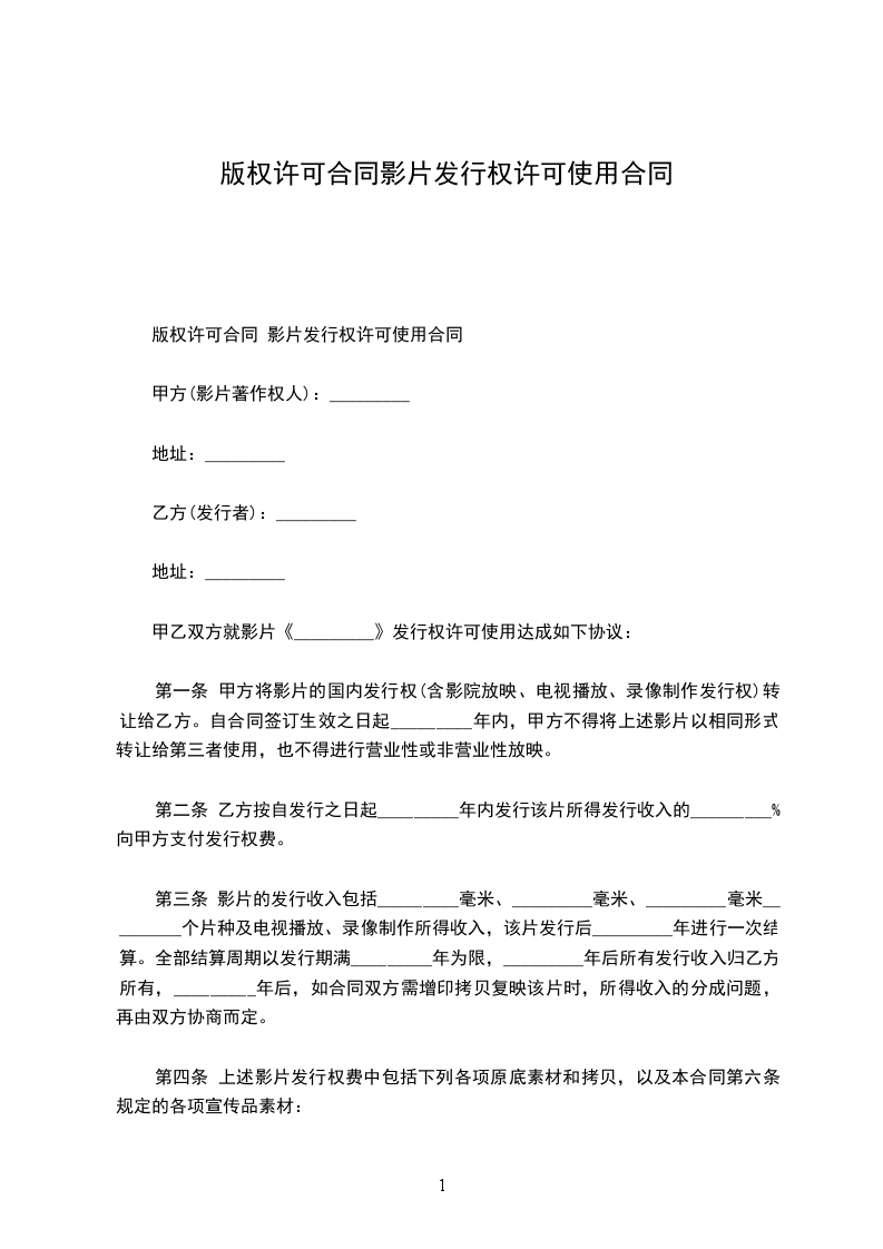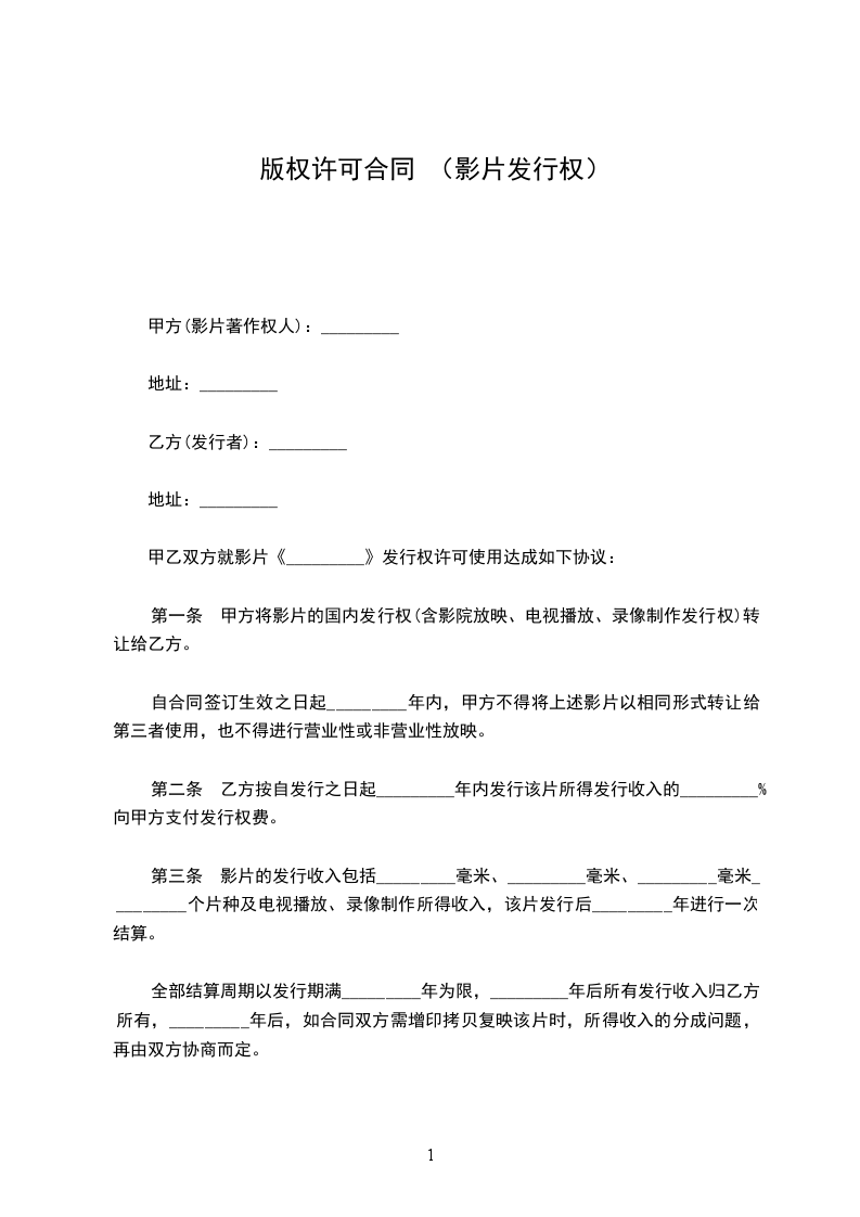 第一条 甲方将影片的国内发行权(含影院放映、电视播放、录像制作发行权)转让给乙方。自合同签订生效之日起_________年内,甲方不得将上述影片以相同形式转让给第三者使用,也不得进行营业性或非营业性放映。