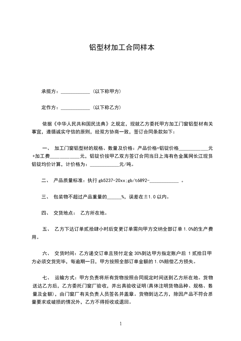 依据《中华人民共和国民法典》之规定,现就乙方委托甲方加工门窗铝型材有关事宜,遵循诚实守信的原则,经双方协商一致,签订合同条款如下:
