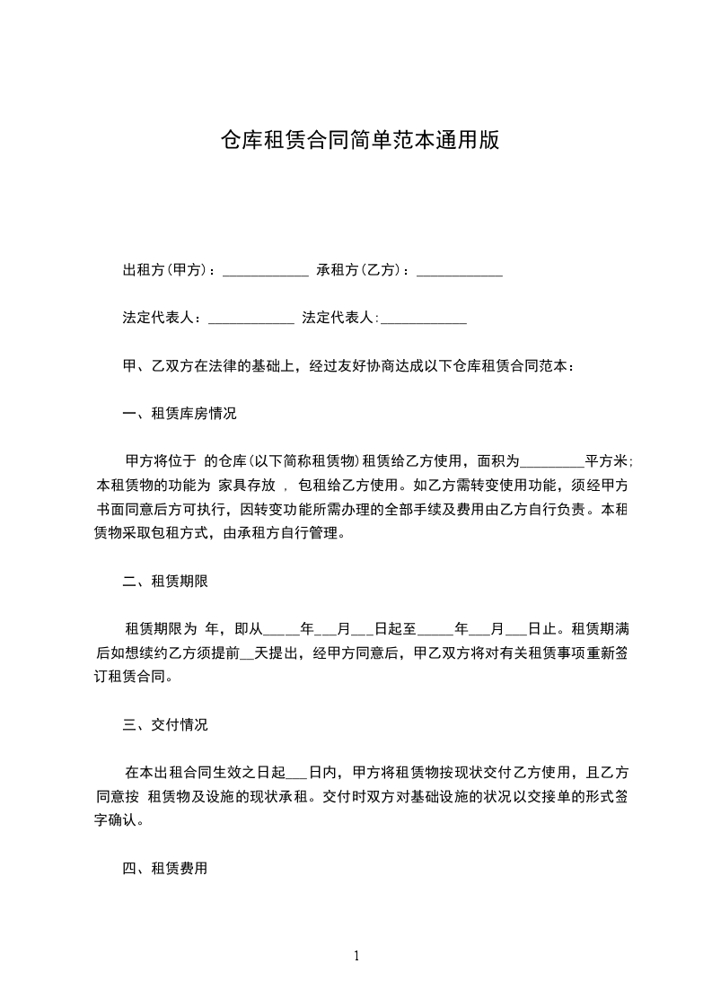 甲、乙双方在法律的基础上,经过友好协商达成以下仓库租赁合同范本: