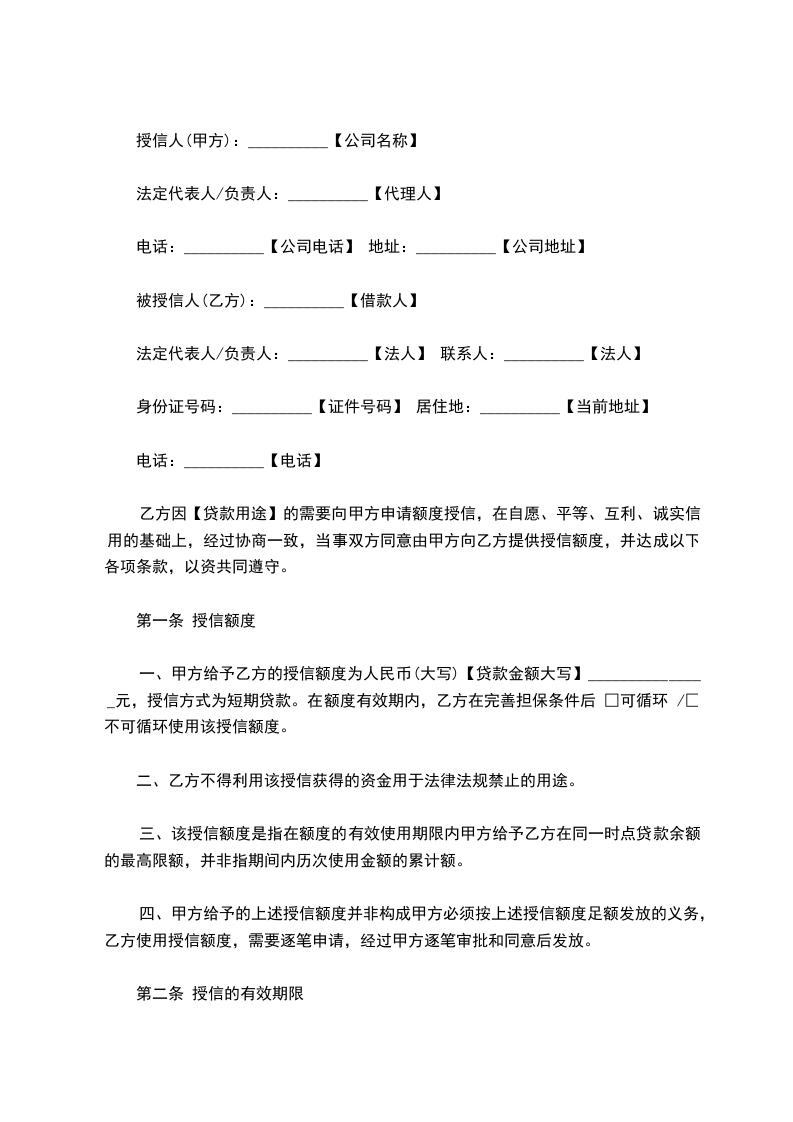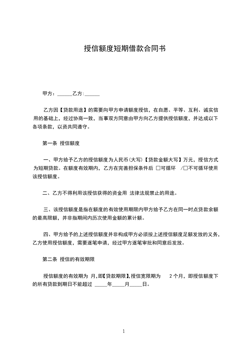 一、甲方给予乙方的授信额度为人民币(大写)【贷款金额大写】_______________元,授信方式为短期贷款。在额度有效期内,乙方在完善担保条件后 □可循环 /□不可循环使用该授信额度。