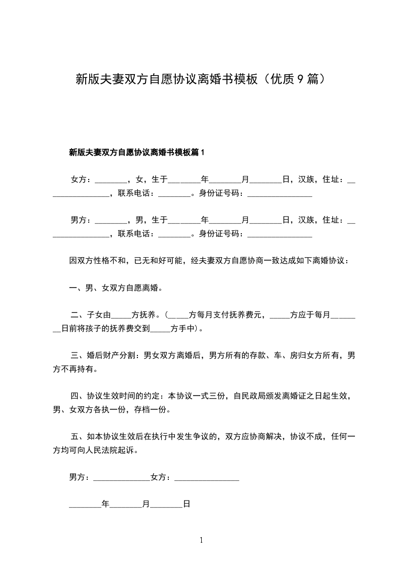 九、本协议一式三份,自婚姻登记处颁发离婚证之日起生效,男、女双方各执一份,婚姻登记机关存档一份。