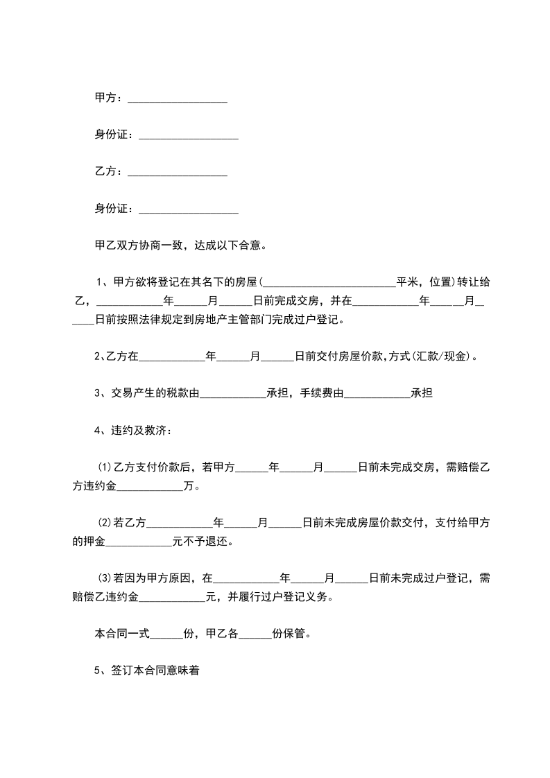 1、甲方欲将登记在其名下的房屋(________________________平米,位置)转让给乙,____________年______月______日前完成交房,并在____________年______月______日前按照法律规定到房地产主管部门完成过户登记。