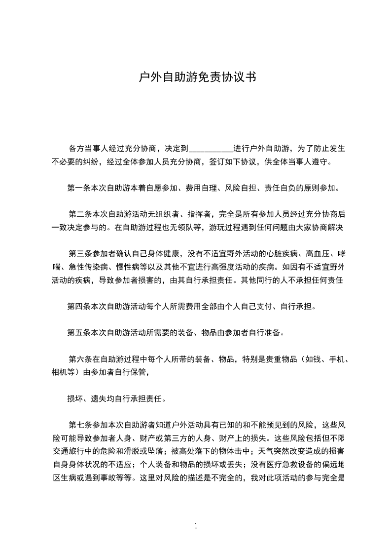 各方当事人经过充分协商,决定到___________进行户外自助游,为了防止发生不必要的纠纷,经过全体参加人员充分协商,签订如下协议,供全体当事人遵守。