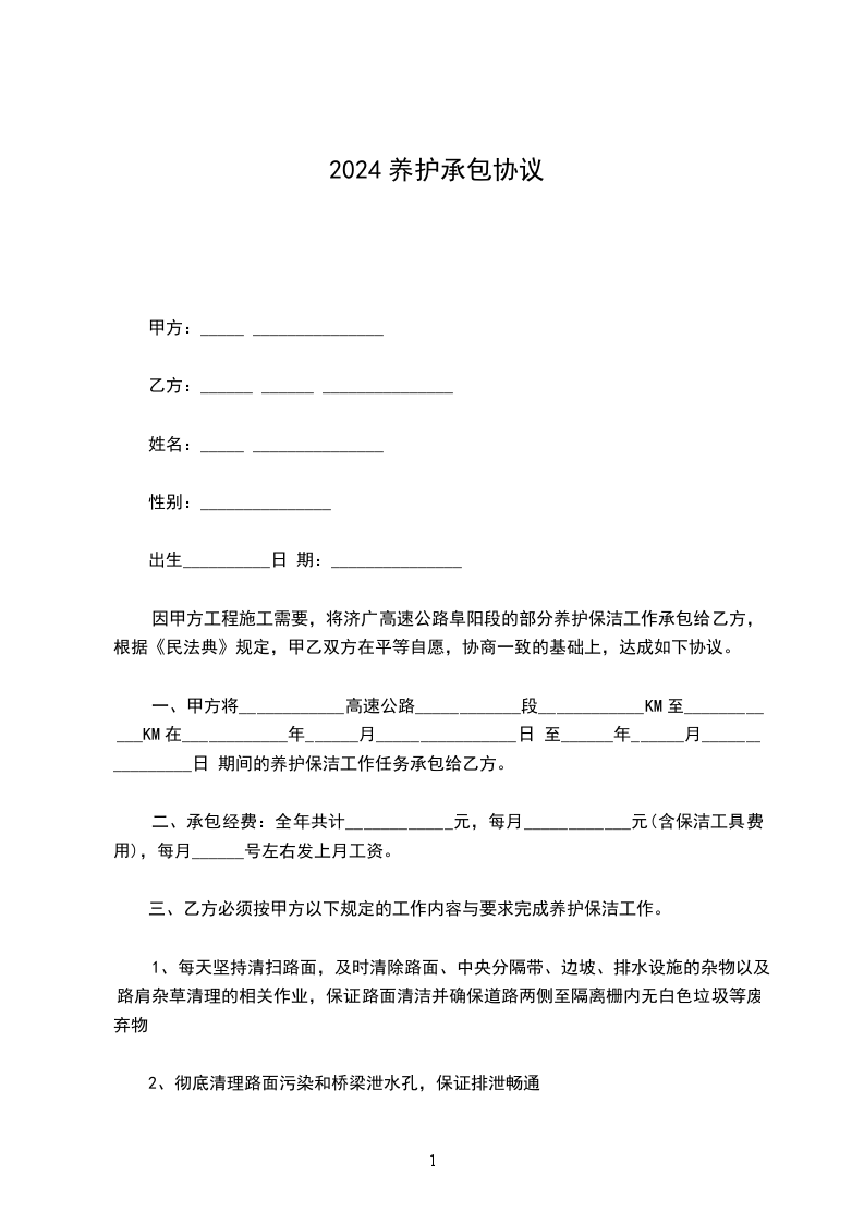 因甲方工程施工需要,将济广高速公路阜阳段的部分养护保洁工作承包给乙方,根据《民法典》规定,甲乙双方在平等自愿,协商一致的基础上,达成如下协议。