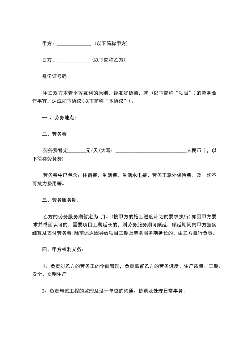 甲乙双方本着平等互利的原则,经友好协商,就 (以下简称“项目”)的劳务合作事宜,达成如下协议(以下简称“本协议”):