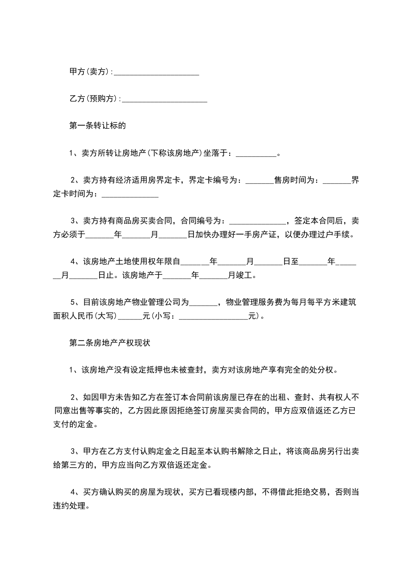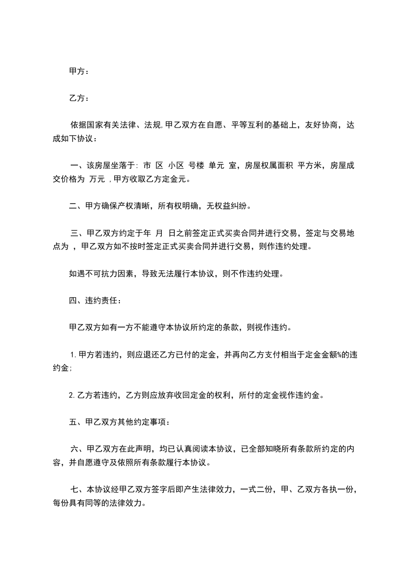预订期限为本协议生效之日起__________天。乙方应于___________年______月_____日之前到甲方营业场所(本市__________区__________路________号)与房屋产权人签署《____________市房屋买卖合同》。