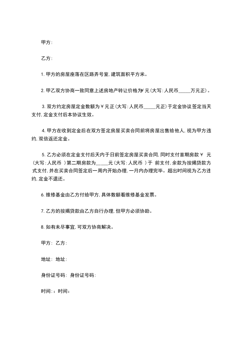 1、乙方同意签署本协议时。向甲方支付意向金人民币______________元,作为甲乙双方履行本协议规定的义务和承诺的担保。在乙方与房屋产权人签署《上海市房屋买卖合同》后,该意向金转为乙方购房款的一部分;