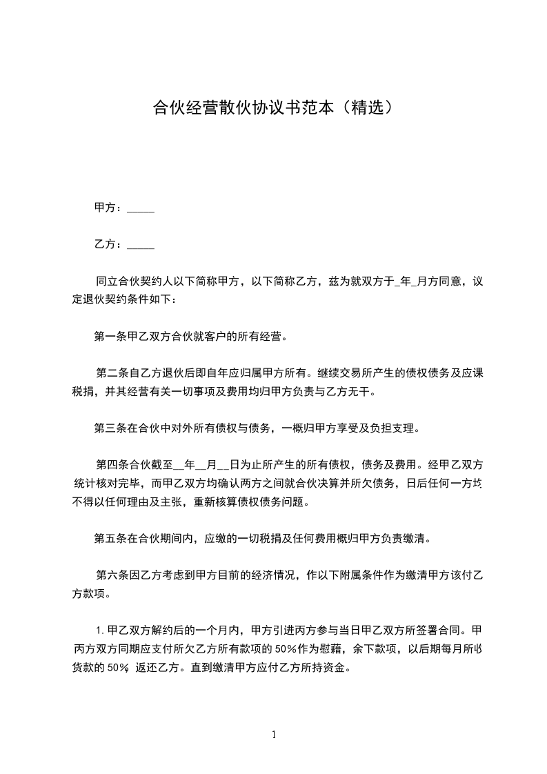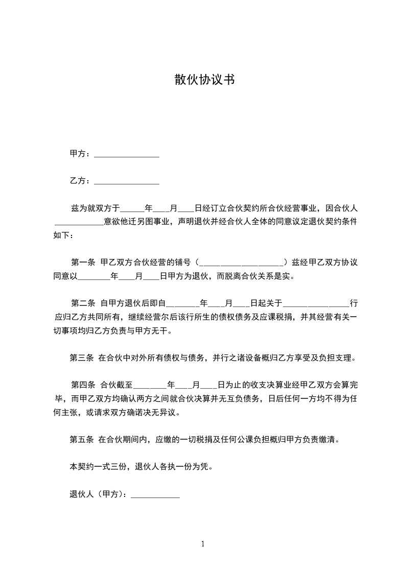 第一条 甲乙双方合伙经营的铺号(____________________)兹经甲乙双方协议同意以________年____月____日甲方为退伙,而脱离合伙关系是实。