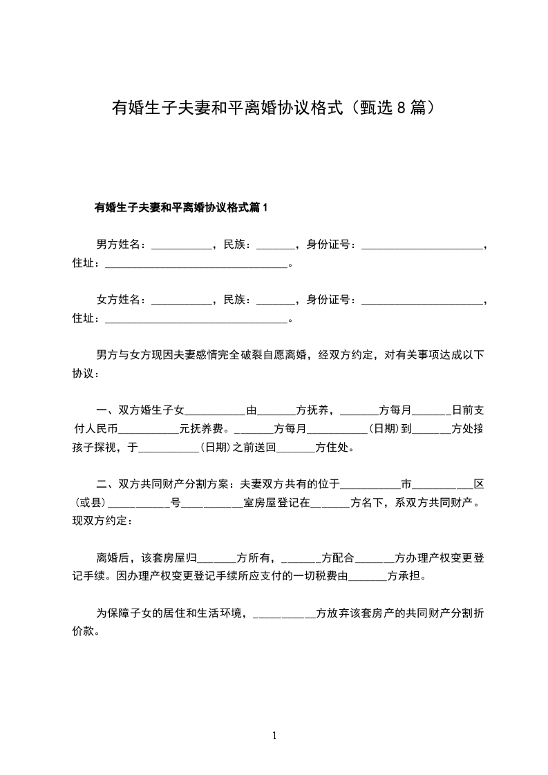 乙方(女方):_________,女,______年____月____日出生,汉族,住________市_____________路_____________________,身份证号:______________________
