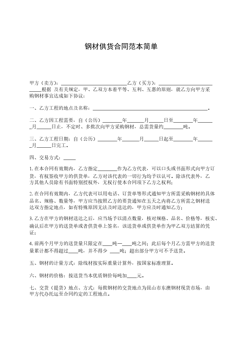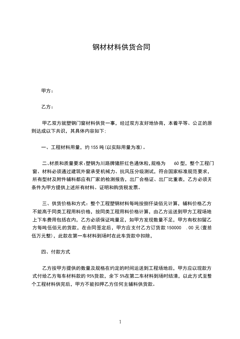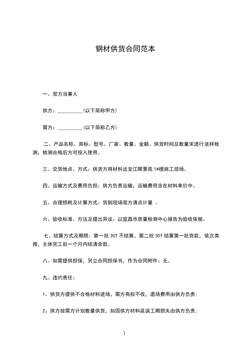 七、结算方式及期限:第一批30T不结算,第二批30T结算第一批货款,依次类推,主体完工后一个月内结清余款。