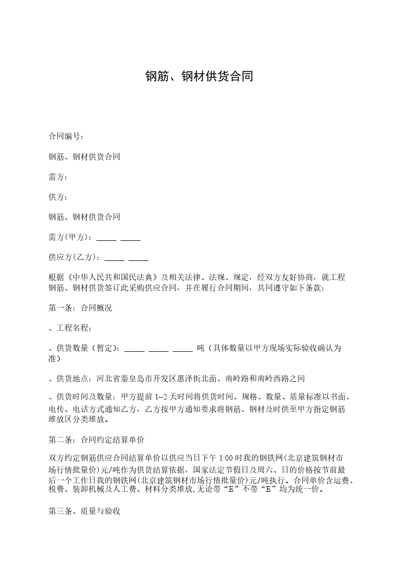 1、供货方提供不合格材料进场,需方有权不收,退场费用由供方负责;