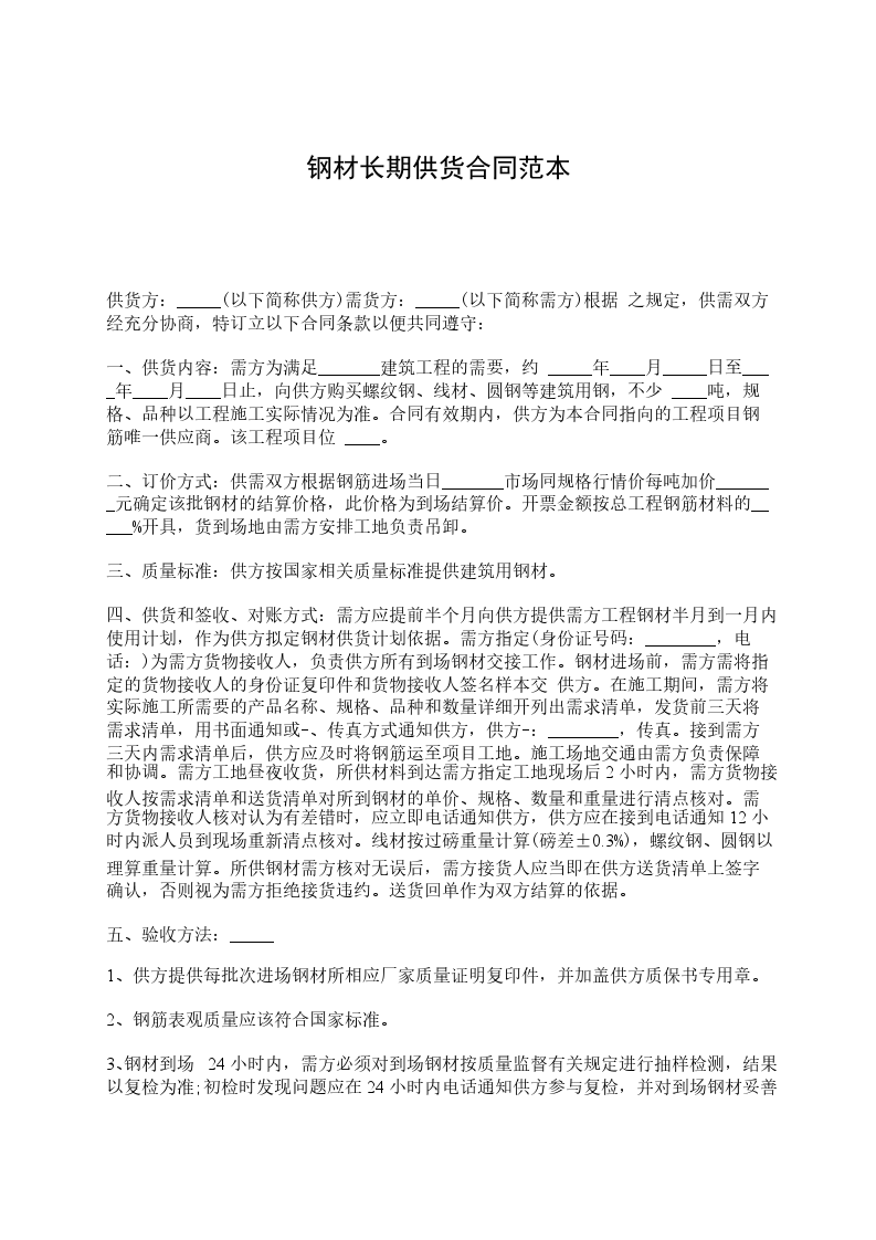 2、供方按需方计划数量供货,如因供方材料延误工期损失由供方负责;