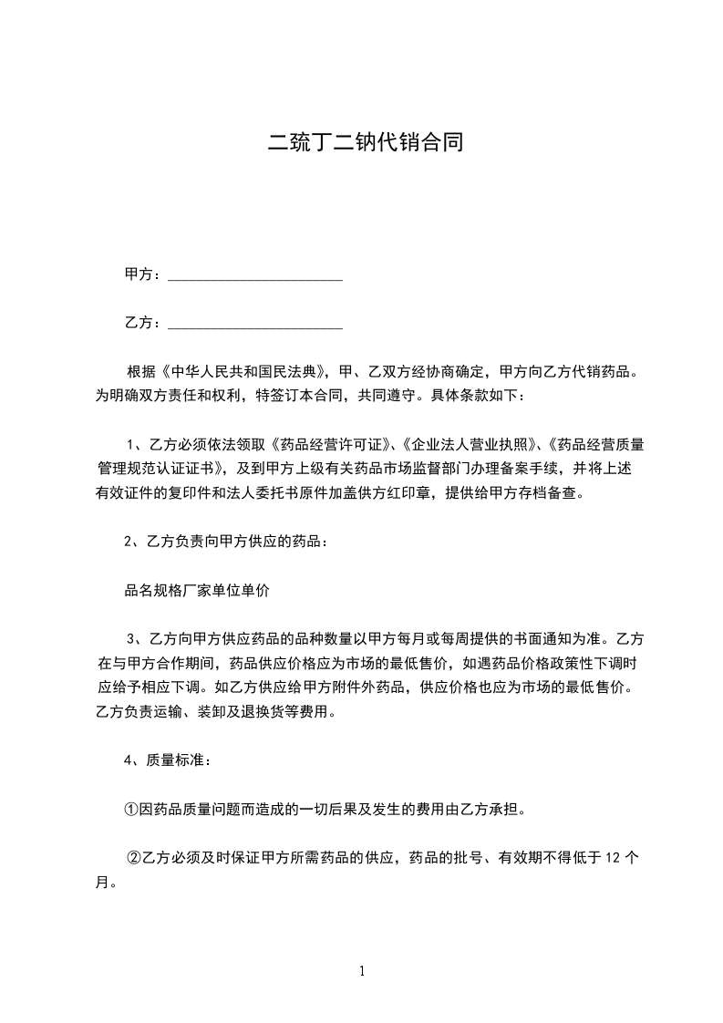 根据《中华人民共和国民法典》,甲、乙双方经协商确定,甲方向乙方代销药品。为明确双方责任和权利,特签订本合同,共同遵守。具体条款如下: