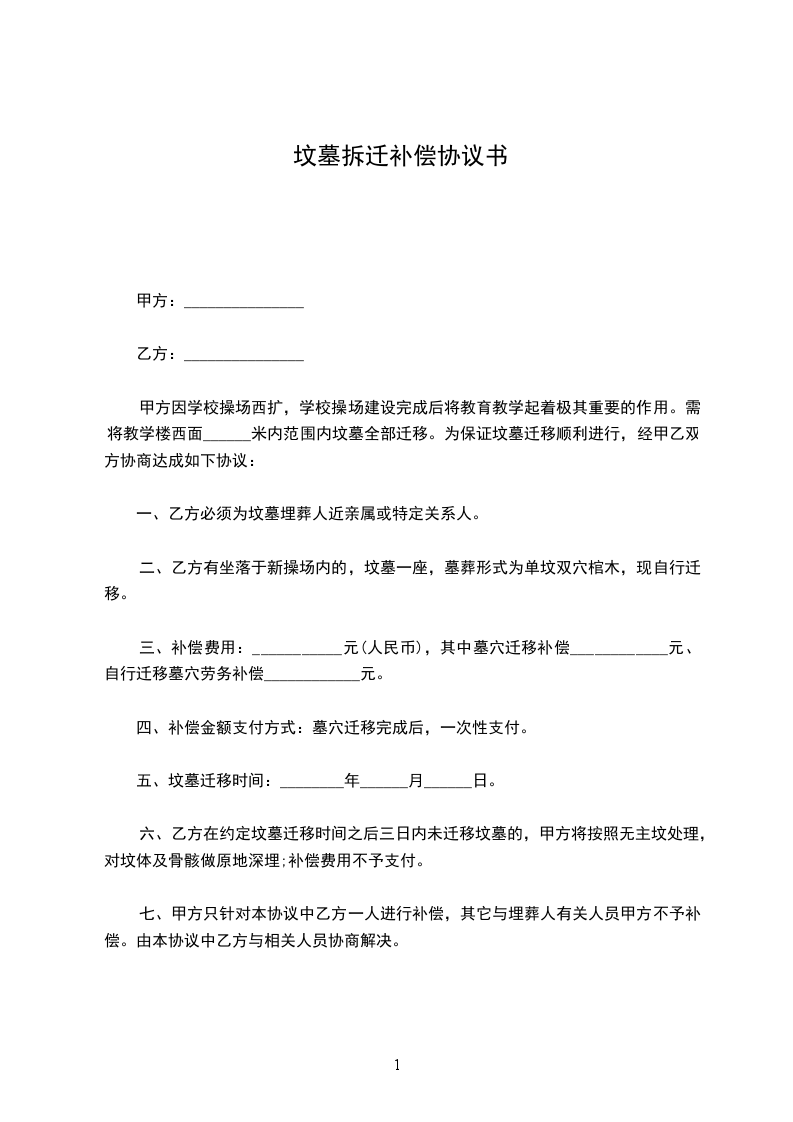 六、乙方在约定坟墓迁移时间之后三日内未迁移坟墓的,甲方将按照无主坟处理,对坟体及骨骸做原地深埋;补偿费用不予支付。