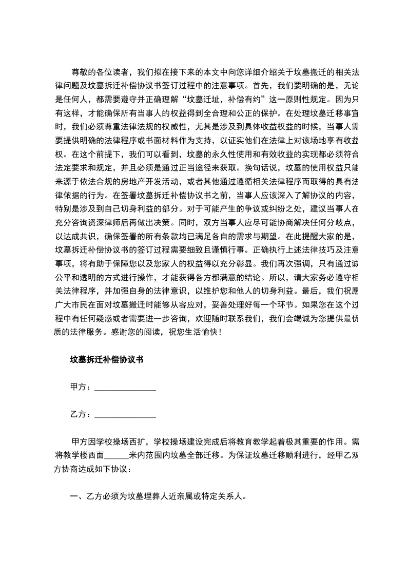 甲方因学校操场西扩,学校操场建设完成后将教育教学起着极其重要的作用。需将教学楼西面______米内范围内坟墓全部迁移。为保证坟墓迁移顺利进行,经甲乙双方协商达成如下协议: