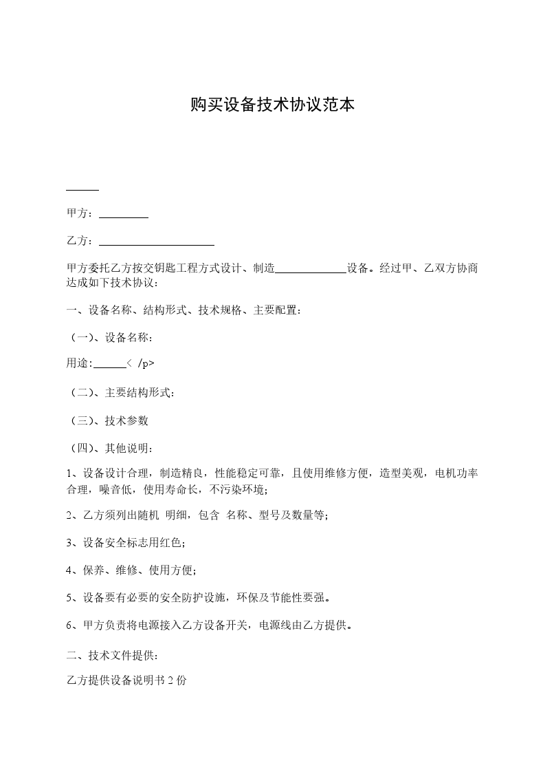 甲方委托乙方按交钥匙工程方式设计、制造_____________设备。经过甲、乙双方协商达成如下技术协议: