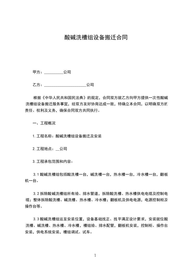 根据《中华人民共和国民法典》的规定,合同双方就乙方向甲方提供一次性酸碱洗槽组设备搬迁服务事宜,经双方友好协商达成一致,特确立本合同,以明确双方的责任、权利及义务,确保合同双方共同执行。