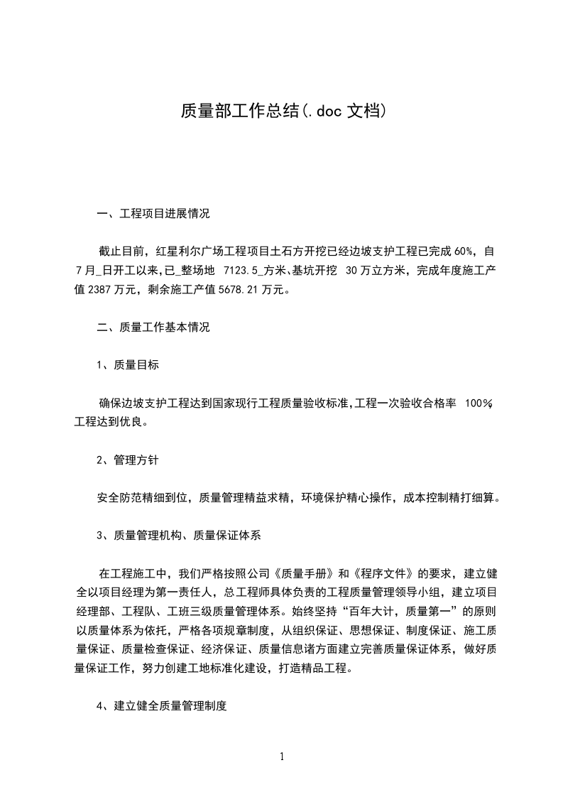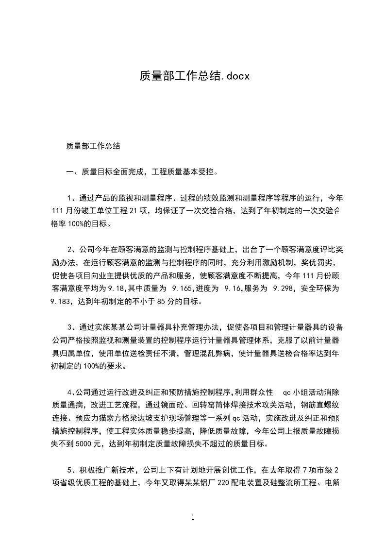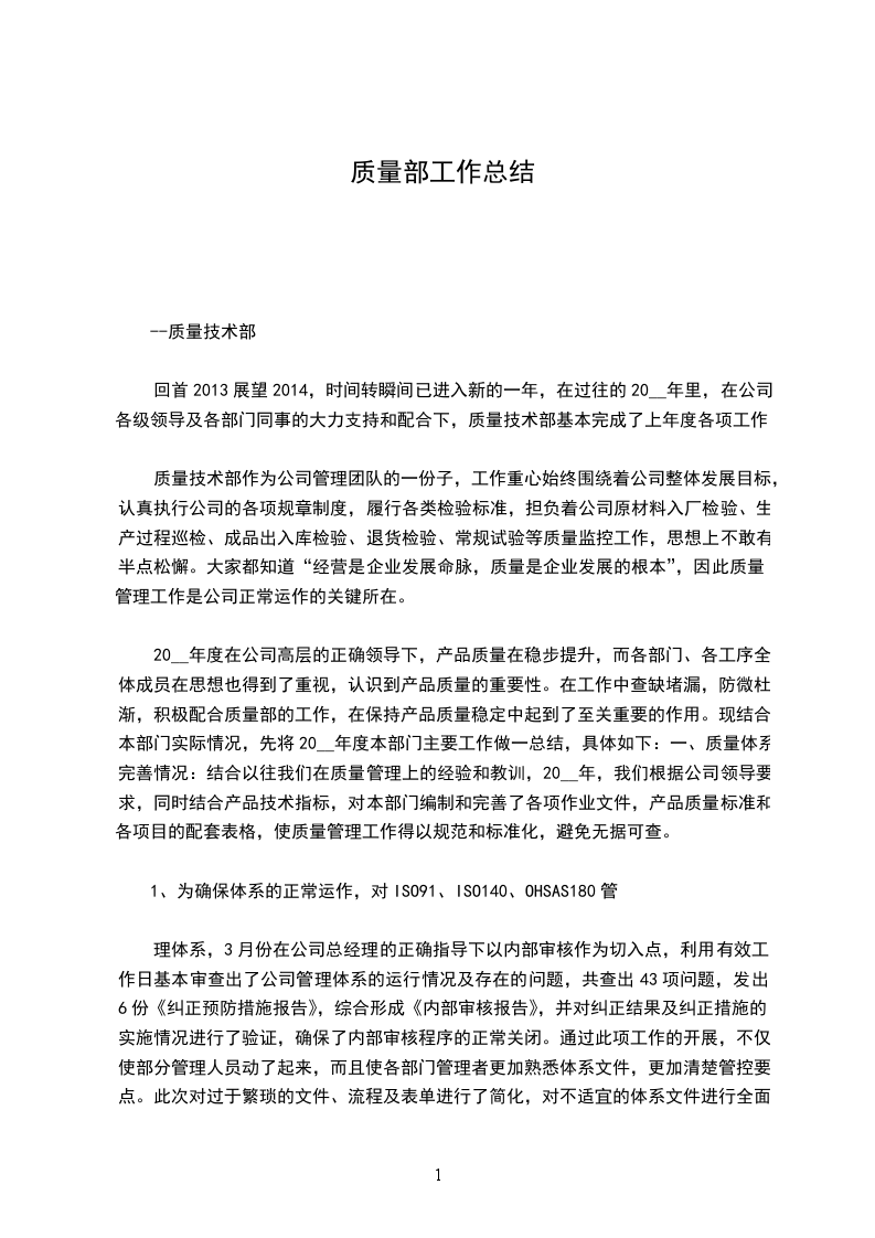 20__年度在公司高层的正确领导下,产品质量在稳步提升,而各部门、各工序全体成员在思想也得到了重视,认识到产品质量的重要性。在工作中查缺堵漏,防微杜渐,积极配合质量部的工作,在保持产品质量稳定中起到了至关重要的作用。现结合本部门实际情况,先将20__年度本部门主要工作做一总结,具体如下:一、质量体系完善情况:结合以往我们在质量管理上的经验和教训,20__年,我们根据公司领导要求,同时结合产品技术指标,对本部门编制和完善了各项作业文件,产品质量标准和各项目的配套表格,使质量管理工作得以规范和标准化,避免无据可查。