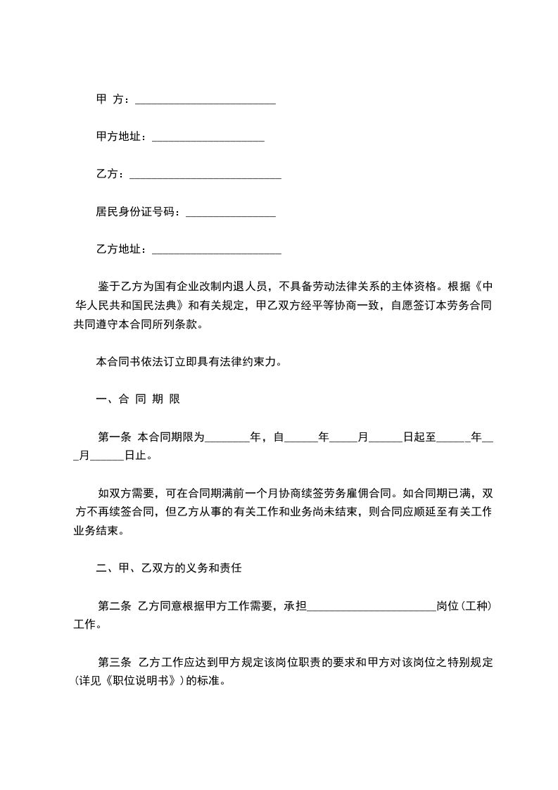 鉴于乙方为国有企业改制内退人员,不具备劳动法律关系的主体资格。根据《中华人民共和国民法典》和有关规定,甲乙双方经平等协商一致,自愿签订本劳务合同,共同遵守本合同所列条款。