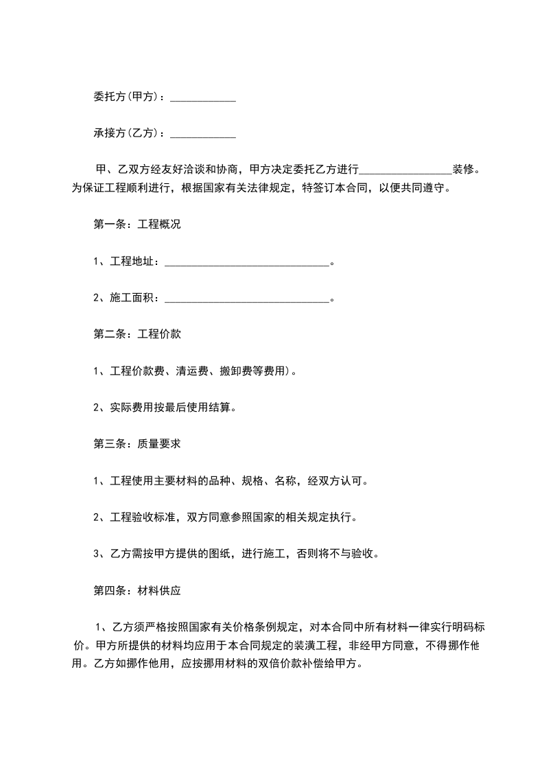 甲、乙双方经友好洽谈和协商,甲方决定委托乙方进行_________________装修。为保证工程顺利进行,根据国家有关法律规定,特签订本合同,以便共同遵守。
