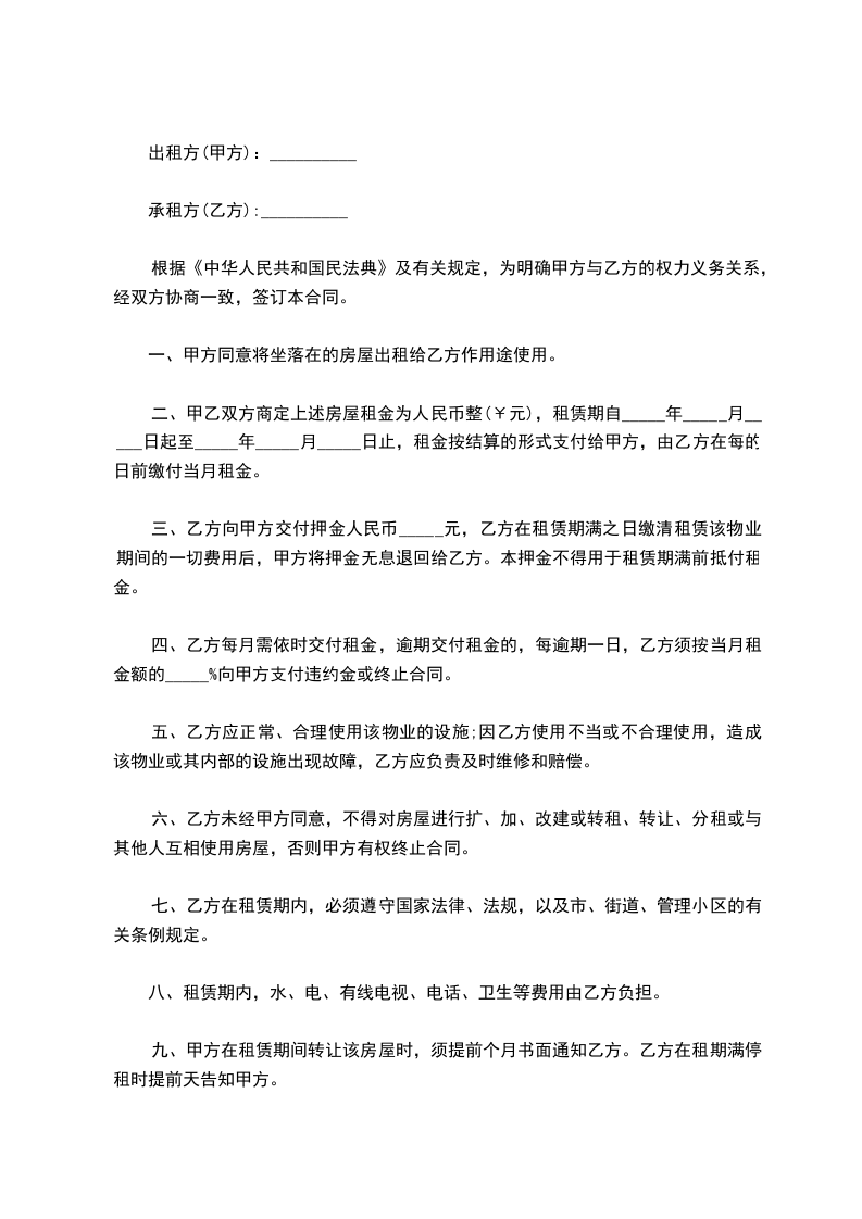 三、乙方向甲方交付住房押金人民币(大写)_________元整,(小写)_________。与首次房租一起交付甲方。该保证金应在该合同终止时乙方不违约的前提下,甲方全额退还给乙方。