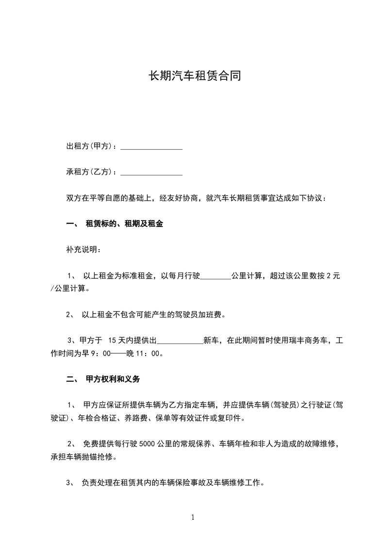 双方在平等自愿的基础上,经友好协商,就汽车长期租赁事宜达成如下协议: