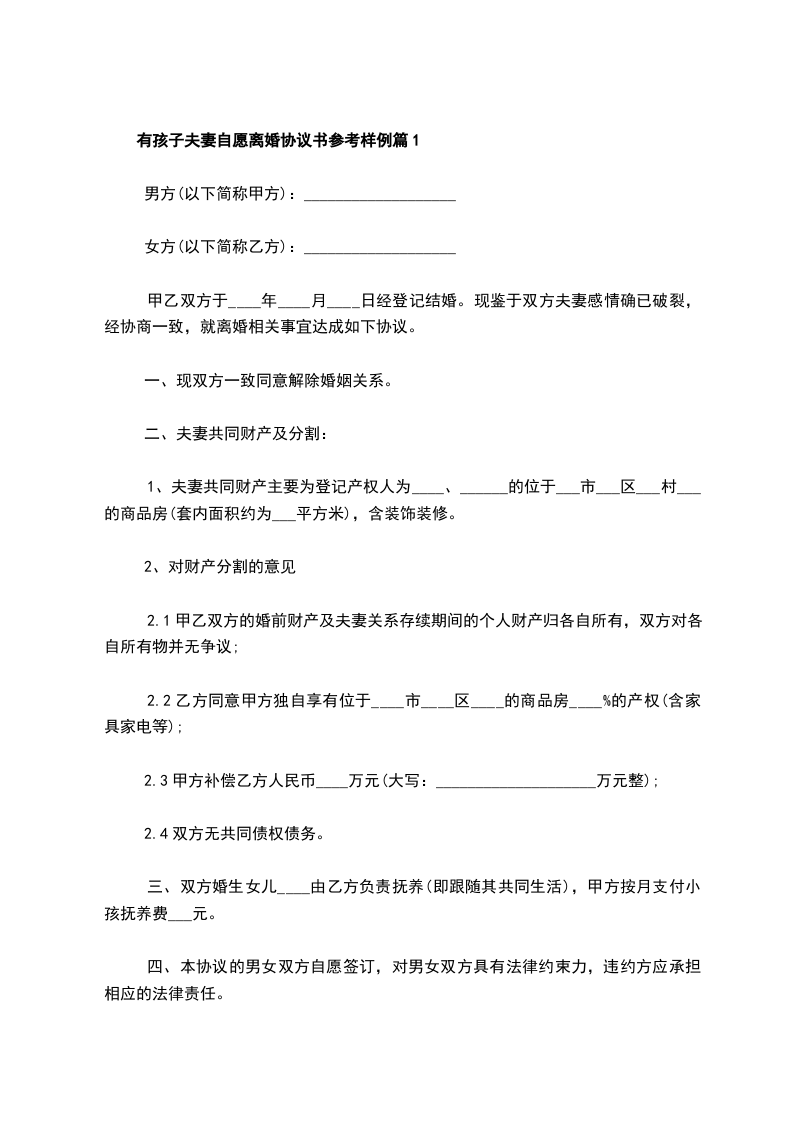 有孩子自愿协议离婚范本参考样例篇2