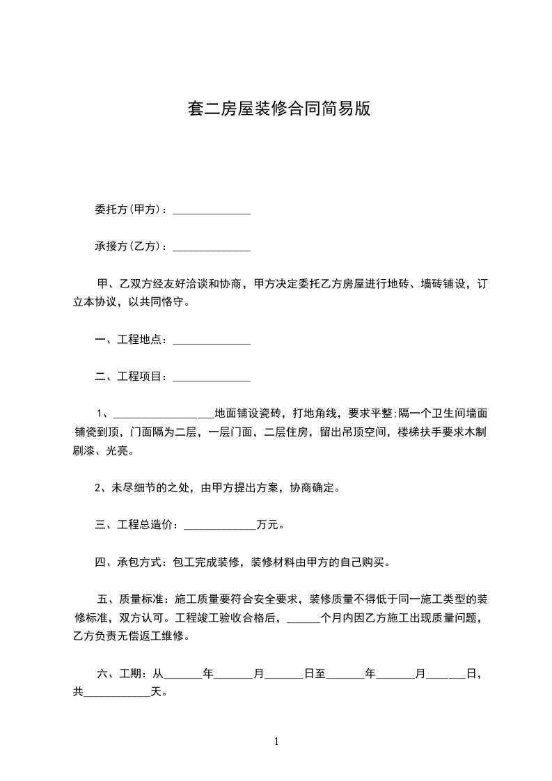四、承包方式:包工完成装修,装修材料由甲方的自己购买。